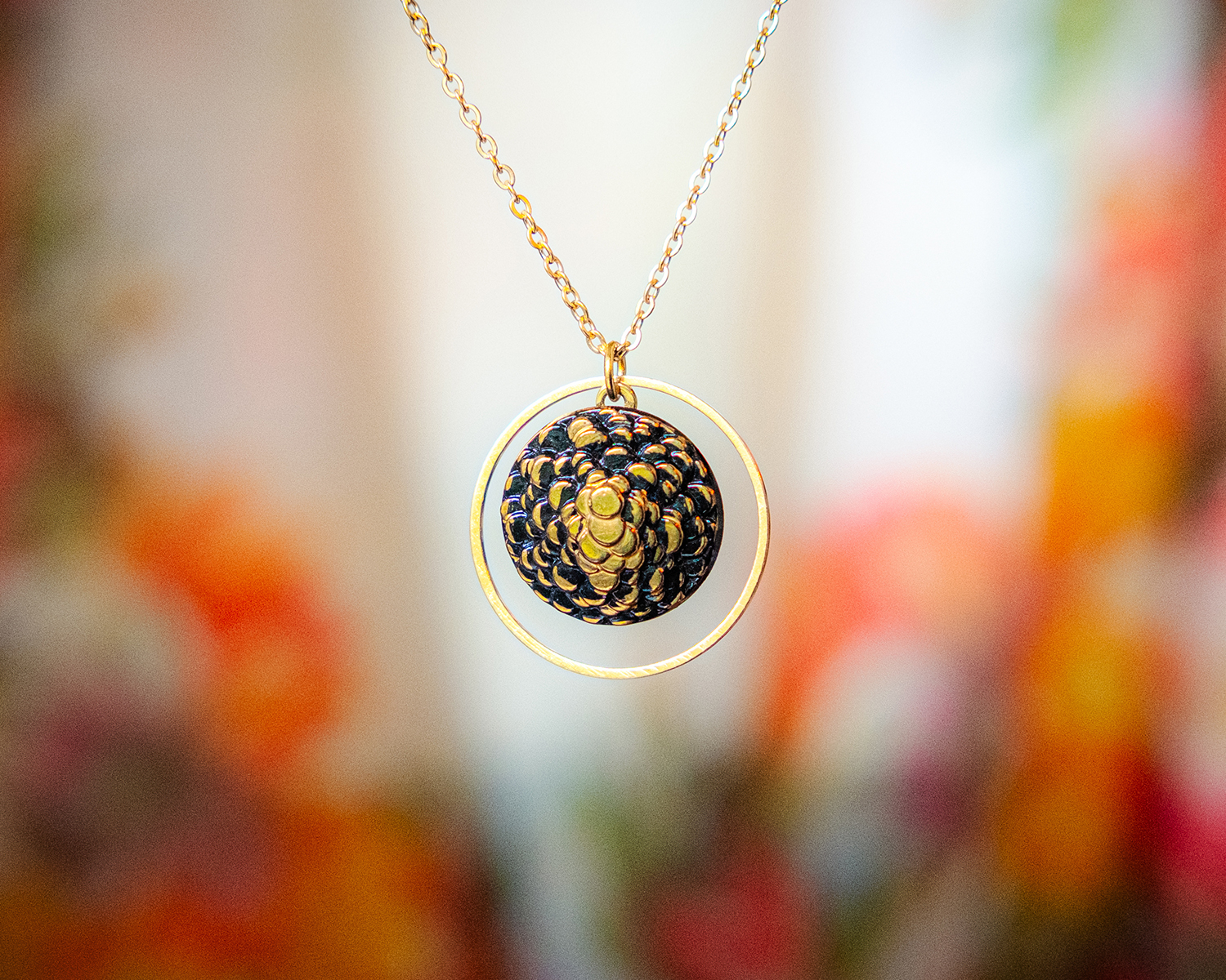 Collier Astre Aliénor dorée, collier orné d’un cercle en acier inoxydable doré et d’un bouton ancien noir et doré des années 1940. Ce collier d’inspiration vintage fait main en verre dans le style art déco par Assuna.