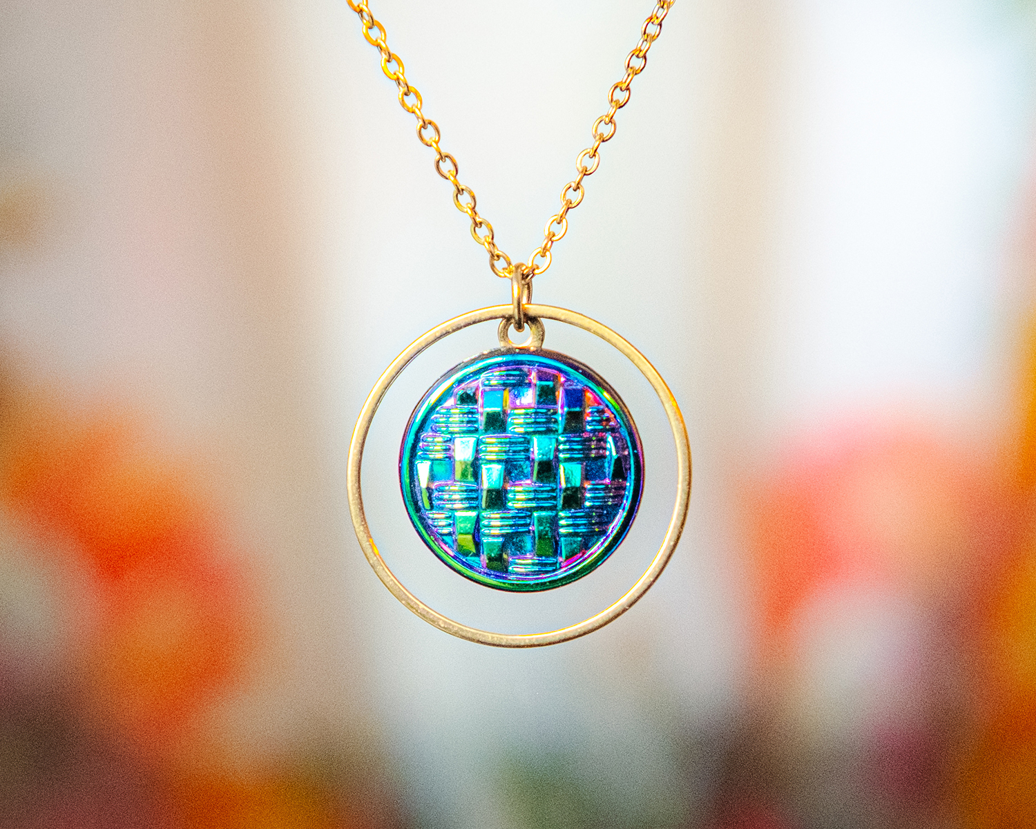 Collier Astre Cécile bleu sirène, collier orné d’un cercle en acier inoxydable doré et d’un bouton ancien bleu et violet des années 1940. Ce collier d’inspiration vintage fait main en verre dans le style art déco par Assuna.