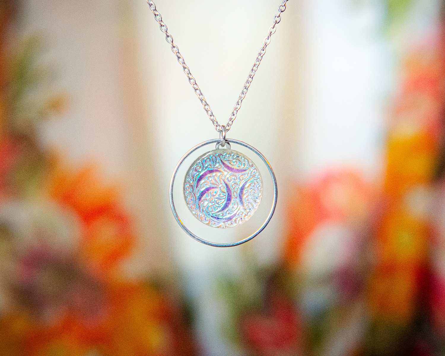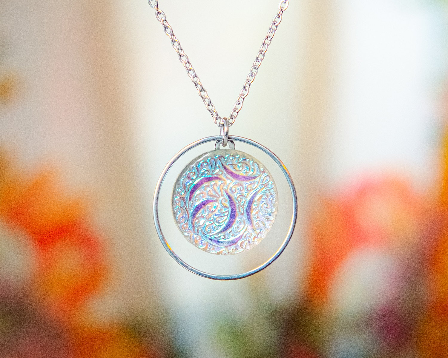 Collier Astre Enide irisée, collier orné d’un cercle en acier inoxydable argenté et d’un bouton ancien transparent et irisé des années 1940. Ce collier d’inspiration vintage fait main en verre dans le style art déco par Assuna.