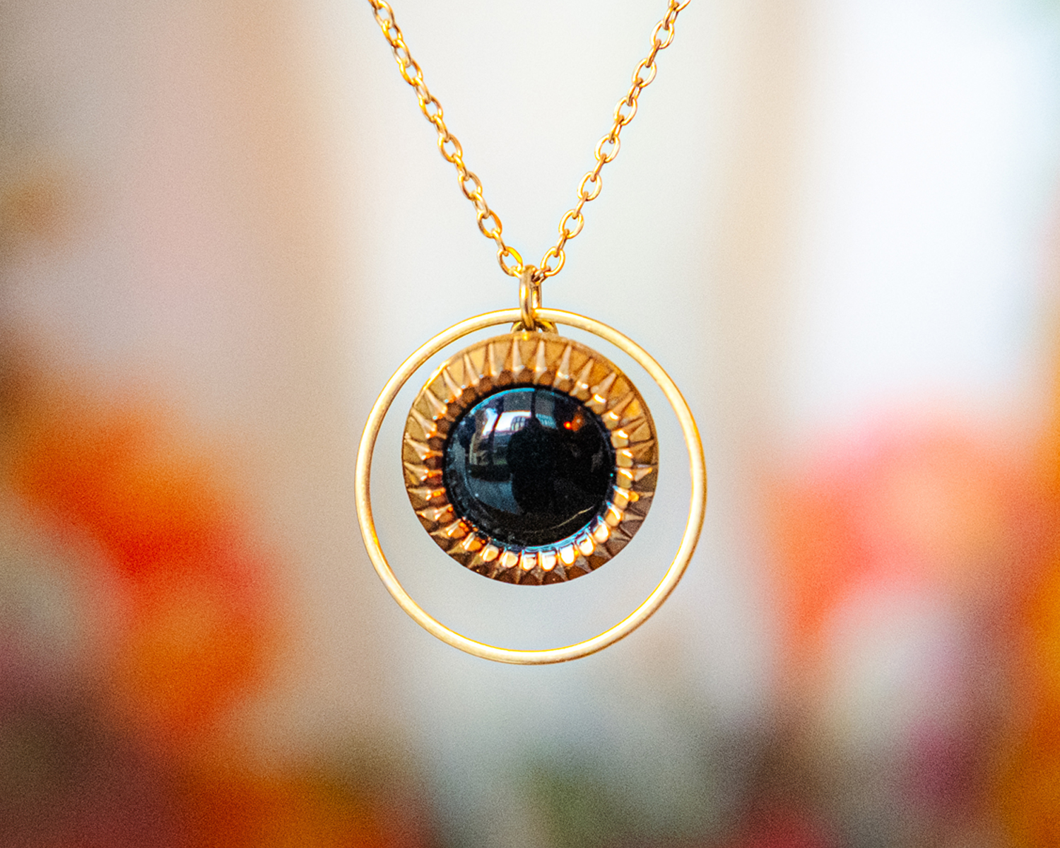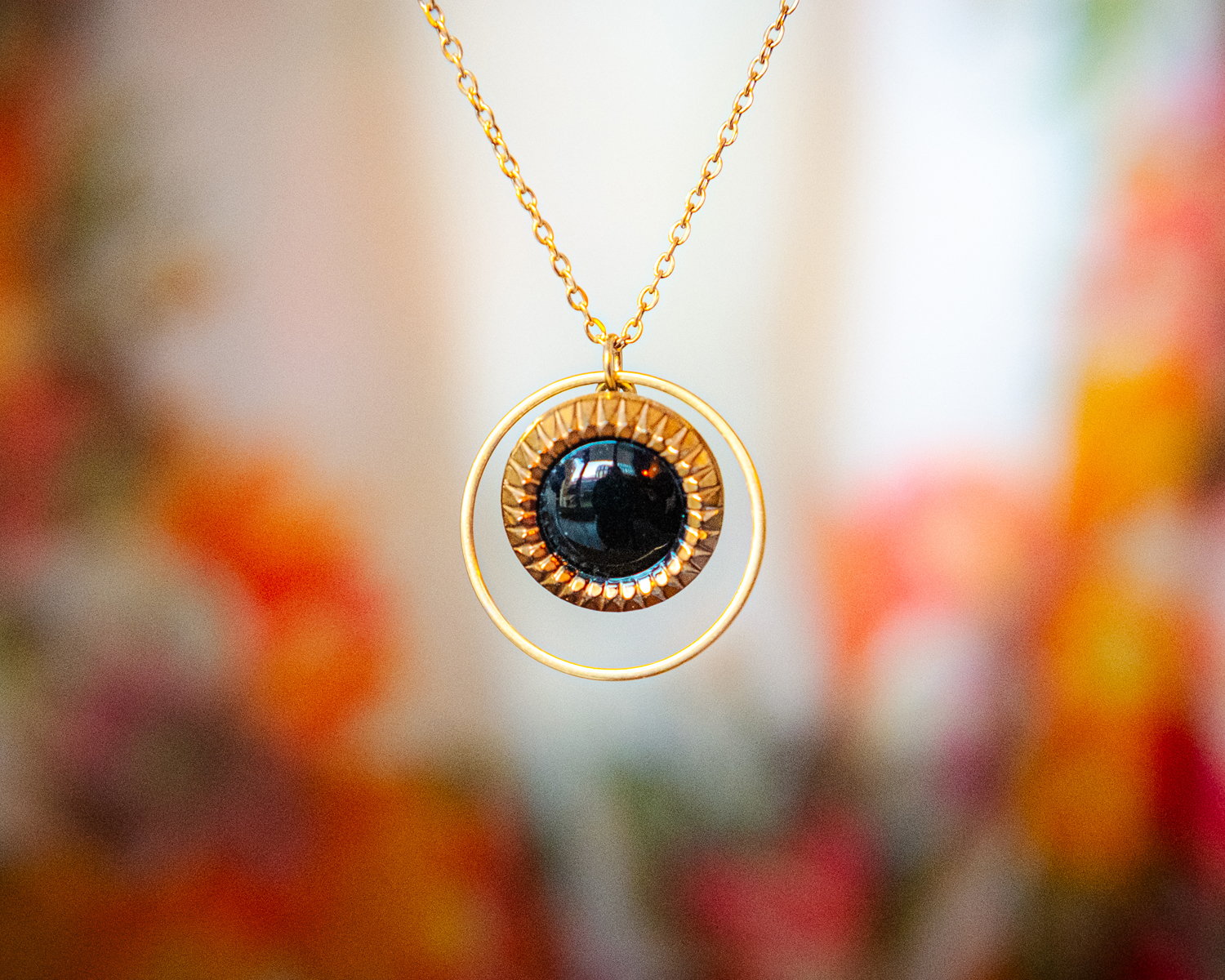 Collier Astre Eva, collier orné d’un cercle en acier inoxydable doré et d’un bouton ancien noir et doré des années 1940. Ce collier d’inspiration vintage fait main en verre dans le style art déco par Assuna.