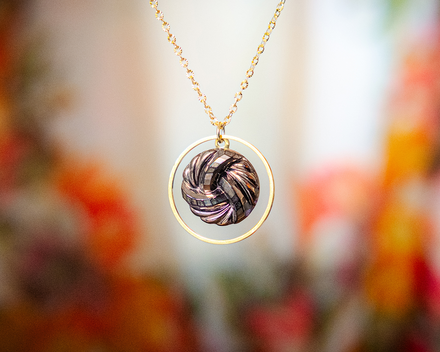 Le collier Solare Paula est orné d’un bouton ancien de haute couture en pâte de verre associés à une estampe en soleil en laiton doré à l’or fin. Ce collier allie charme vintage des années 1940 et tendance intemporelle. Véritable morceau d’histoire, pépite upcyclée, il est en somme parfait pour vous !