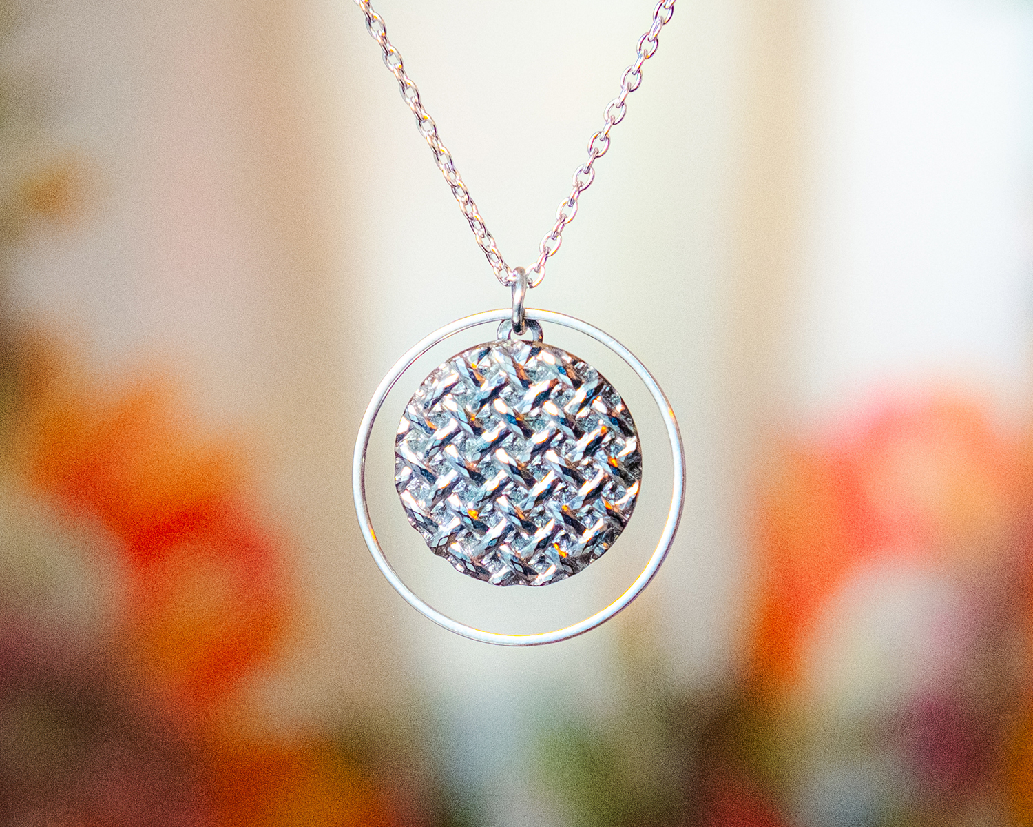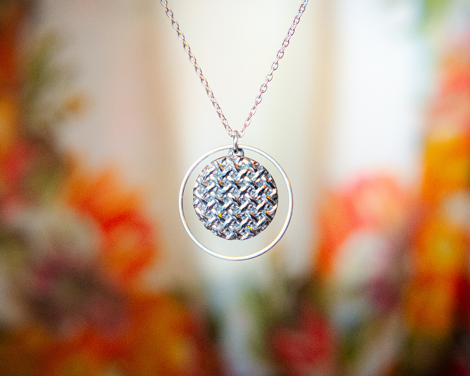 Collier Astre Phylise, collier orné d’un cercle en acier inoxydable argenté et d’un bouton ancien argenté des années 1940. Ce collier d’inspiration vintage fait main en verre dans le style art déco par Assuna.