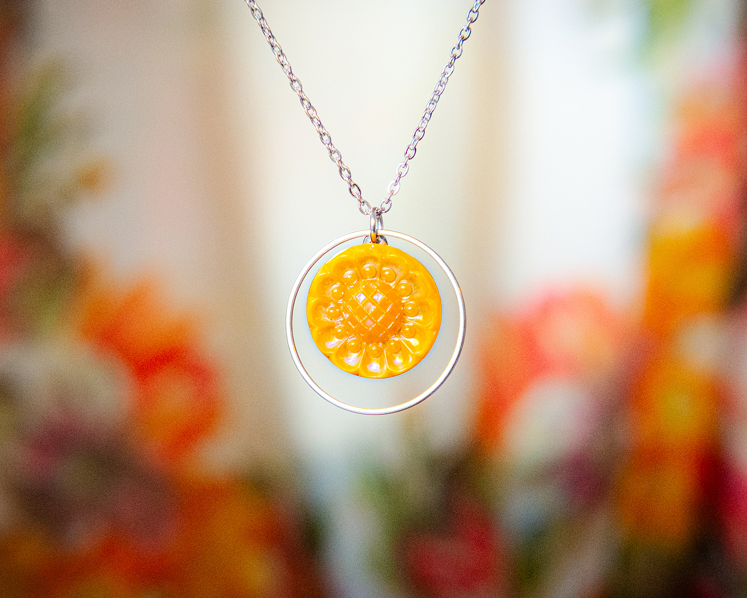 Collier Astre Pivoine, collier orné d’un cercle en acier inoxydable argenté et d’un bouton ancien orange des années 1940. Ce collier d’inspiration vintage fait main en verre dans le style art déco par Assuna.