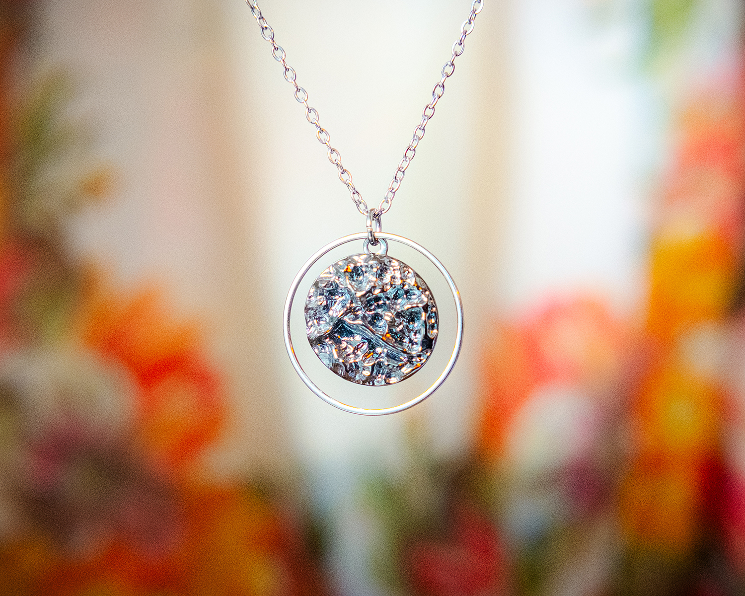 Collier Astre Vera argentée, collier orné d’un cercle en acier inoxydable argenté et d’un bouton ancien argenté des années 1940. Ce collier d’inspiration vintage fait main en verre dans le style art déco par Assuna.