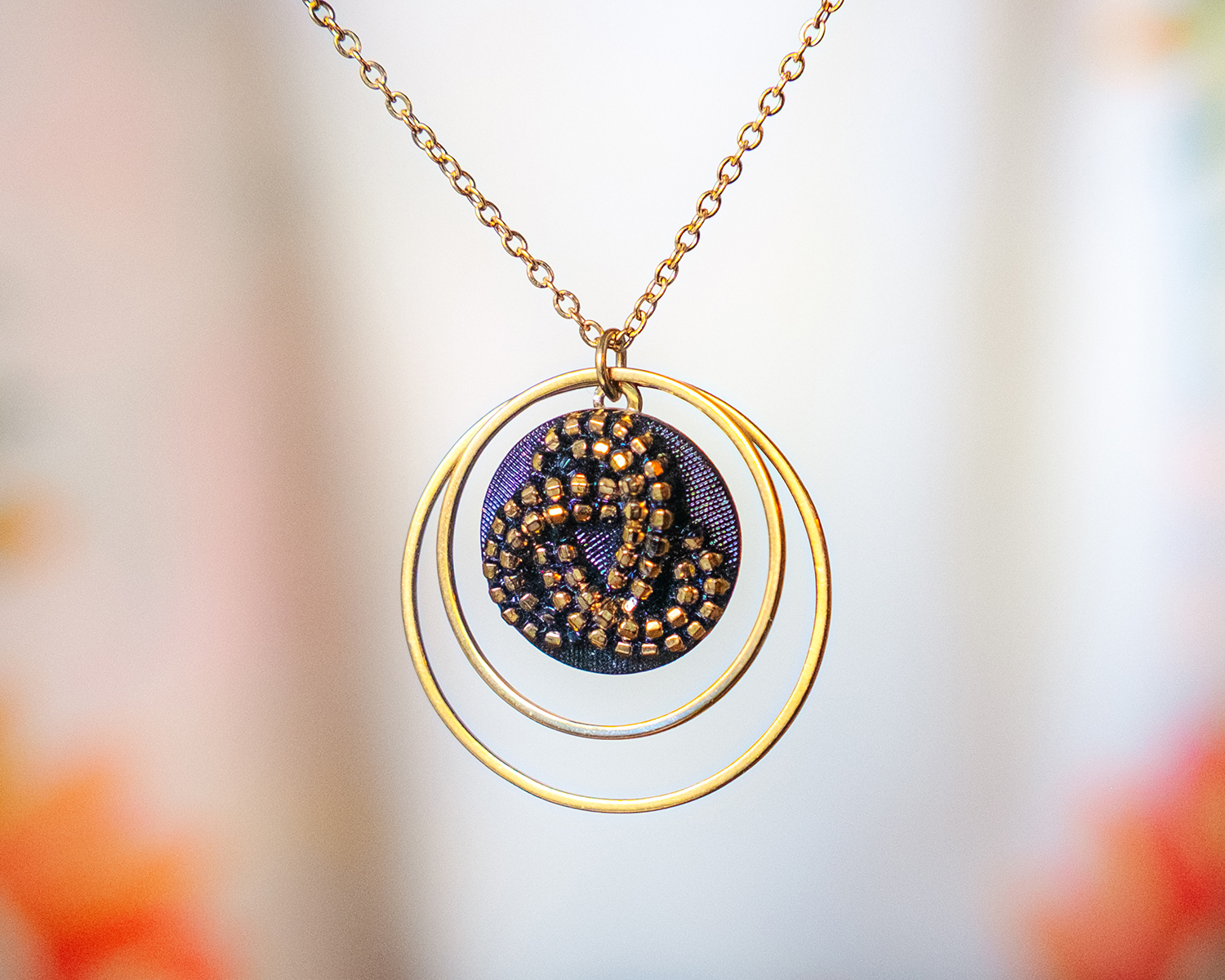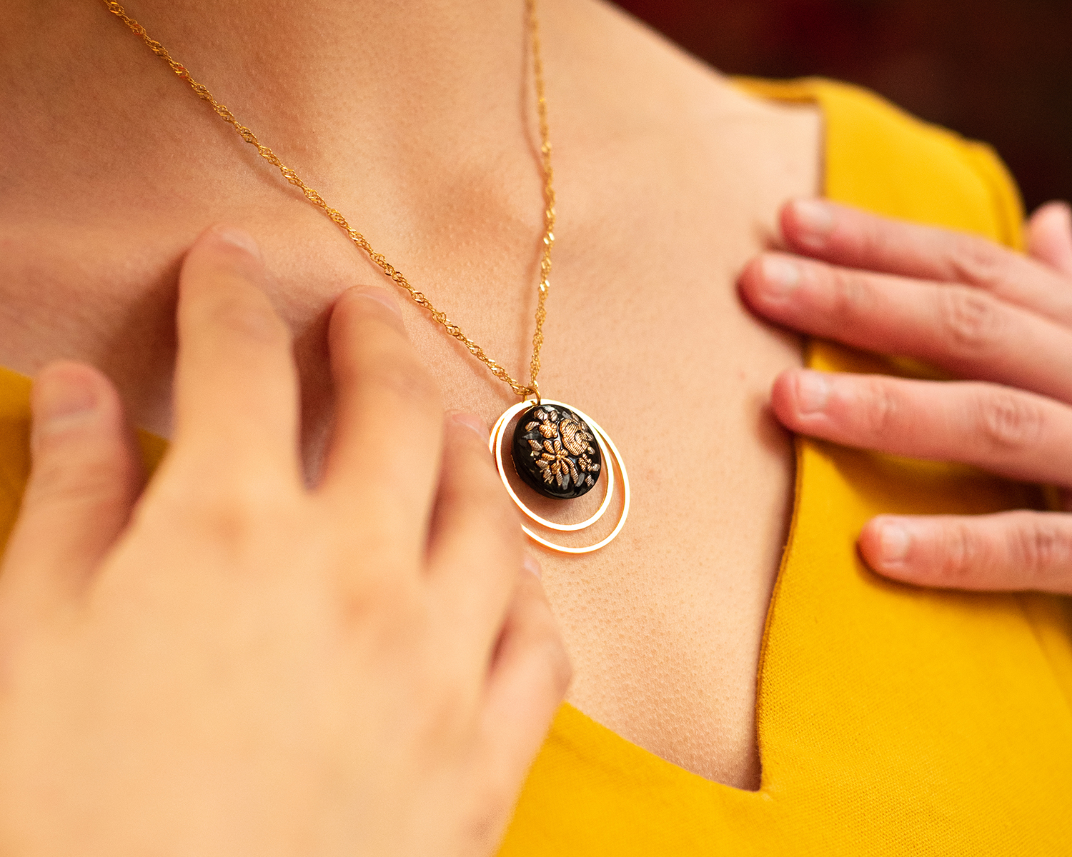 Collier Lunare Berthe dorée, collier orné d’un double cercle formant un croissant de lune en acier inoxydable doré et d’un bouton ancien noir et doré des années 1940. Ce collier d’inspiration vintage fait main en verre dans le style art déco par Assuna.