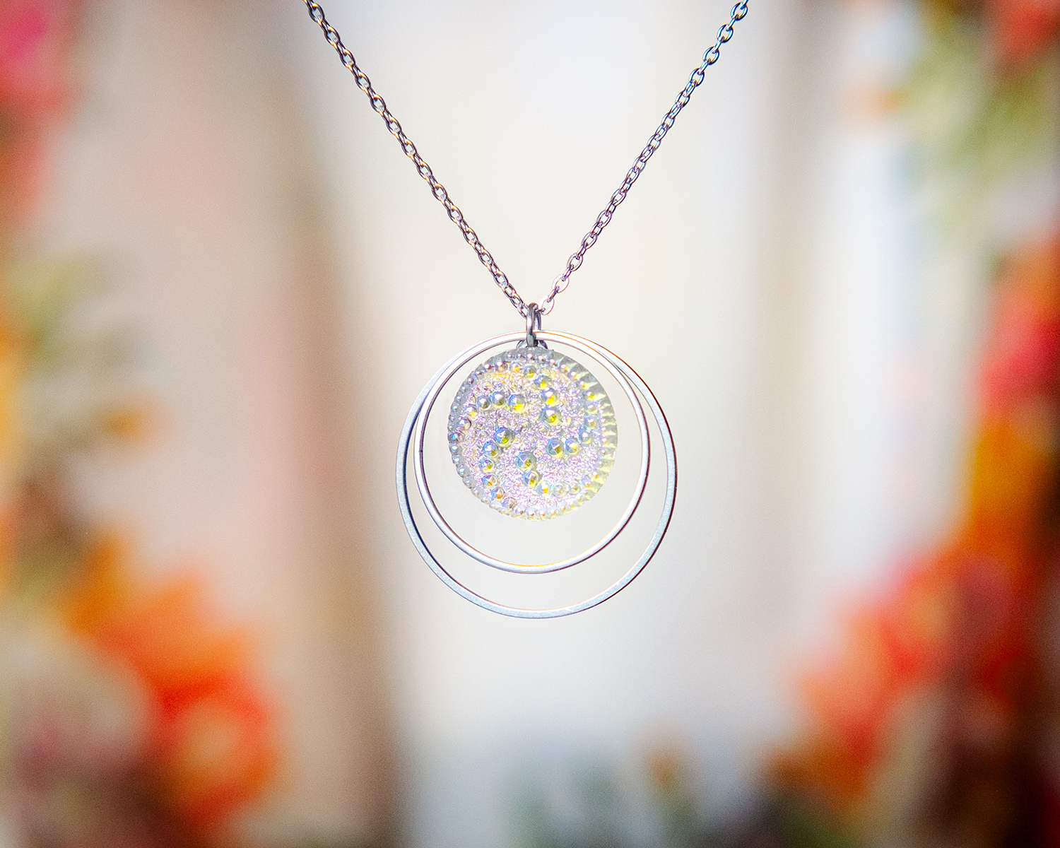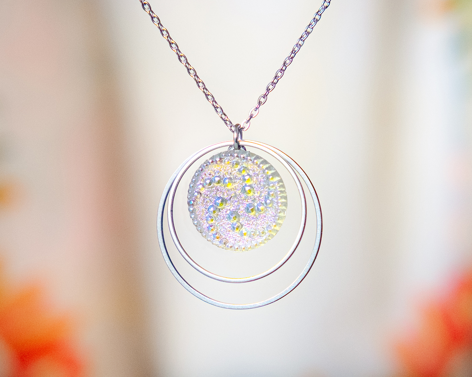 Collier Lunare Hermine, collier orné d’un double cercle formant un croissant de lune en acier inoxydable argenté et d’un bouton ancien transparent et irisé des années 1940. Ce collier d’inspiration vintage fait main en verre dans le style art déco par Assuna.