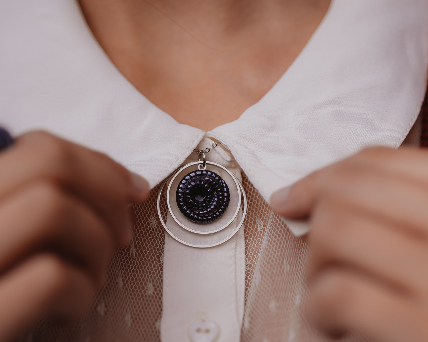 Le collier Lunare Zoé est orné d’un double cercle formant un croissant de lune et d’un bouton ancien argenté des années 1940 fait main en verre dans le style art déco.