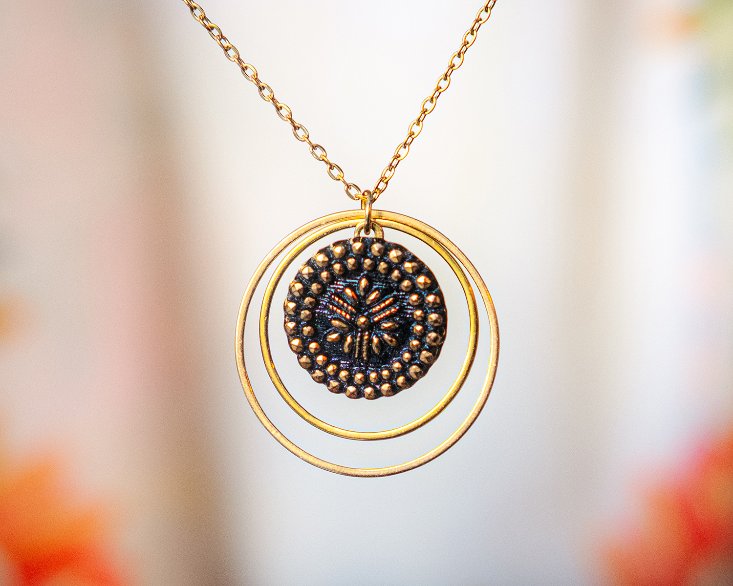 Collier Lunare Maud, collier orné d’un double cercle formant un croissant de lune en acier inoxydable doré et d’un bouton ancien noir et doré des années 1940. Ce collier d’inspiration vintage fait main en verre dans le style art déco par Assuna.