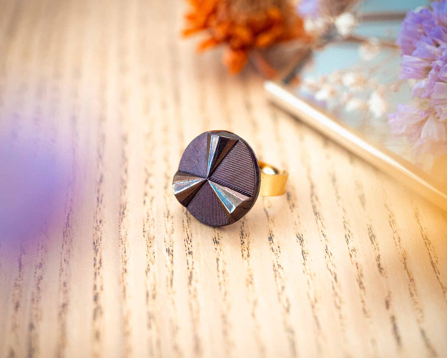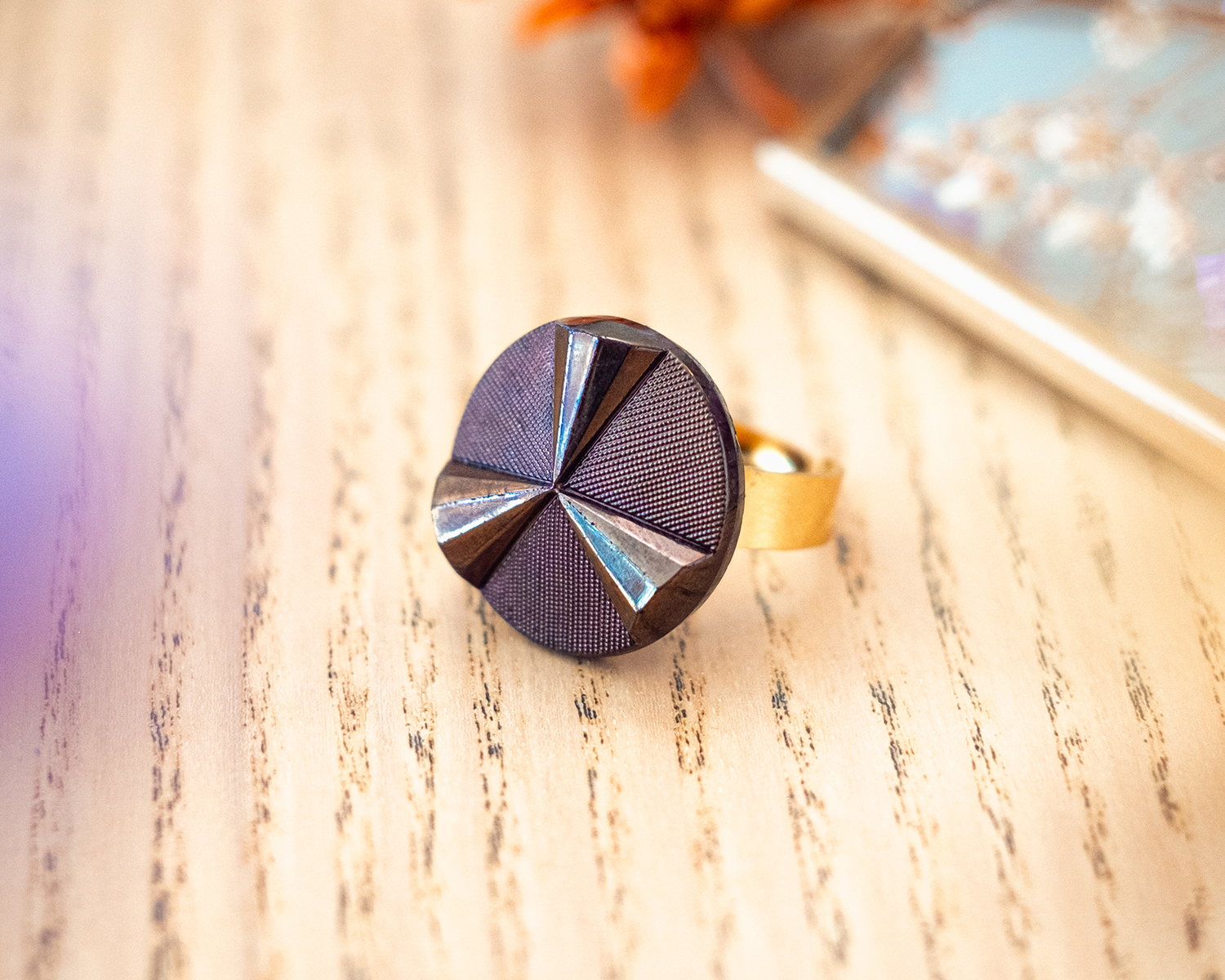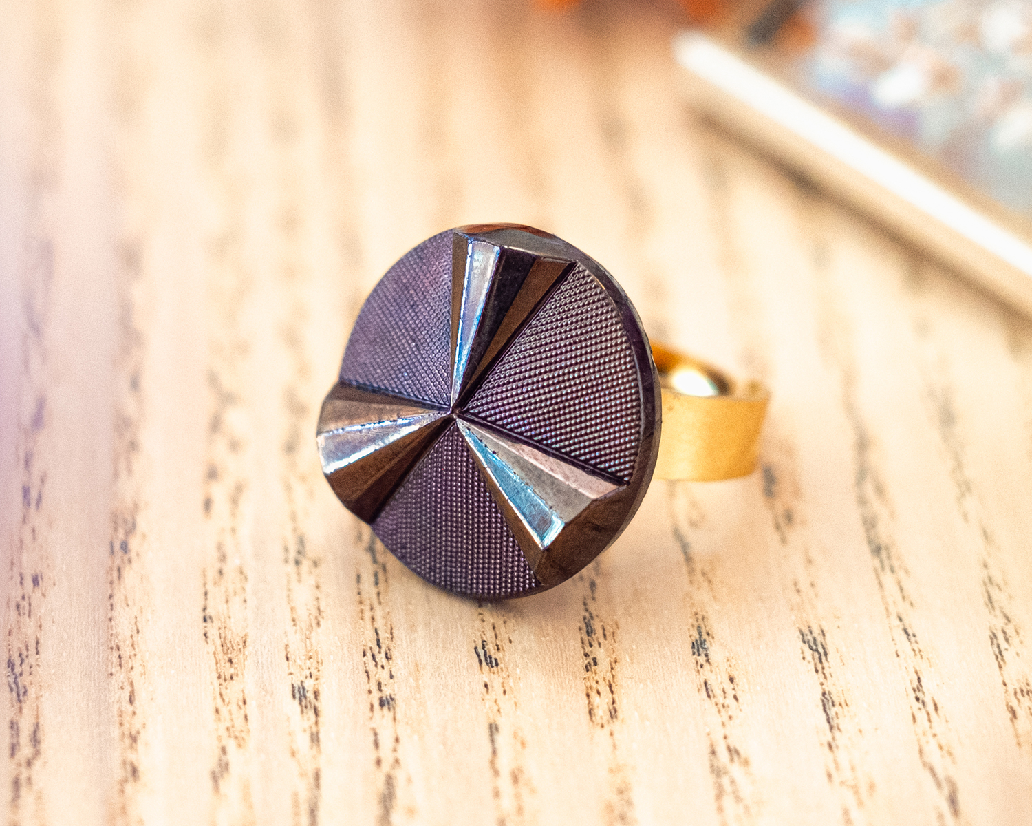 Grande bague Angèle bronze, bague réglable ornée d’un bouton vintage des années 1940 fait main en verre dans le style art déco par Assuna.