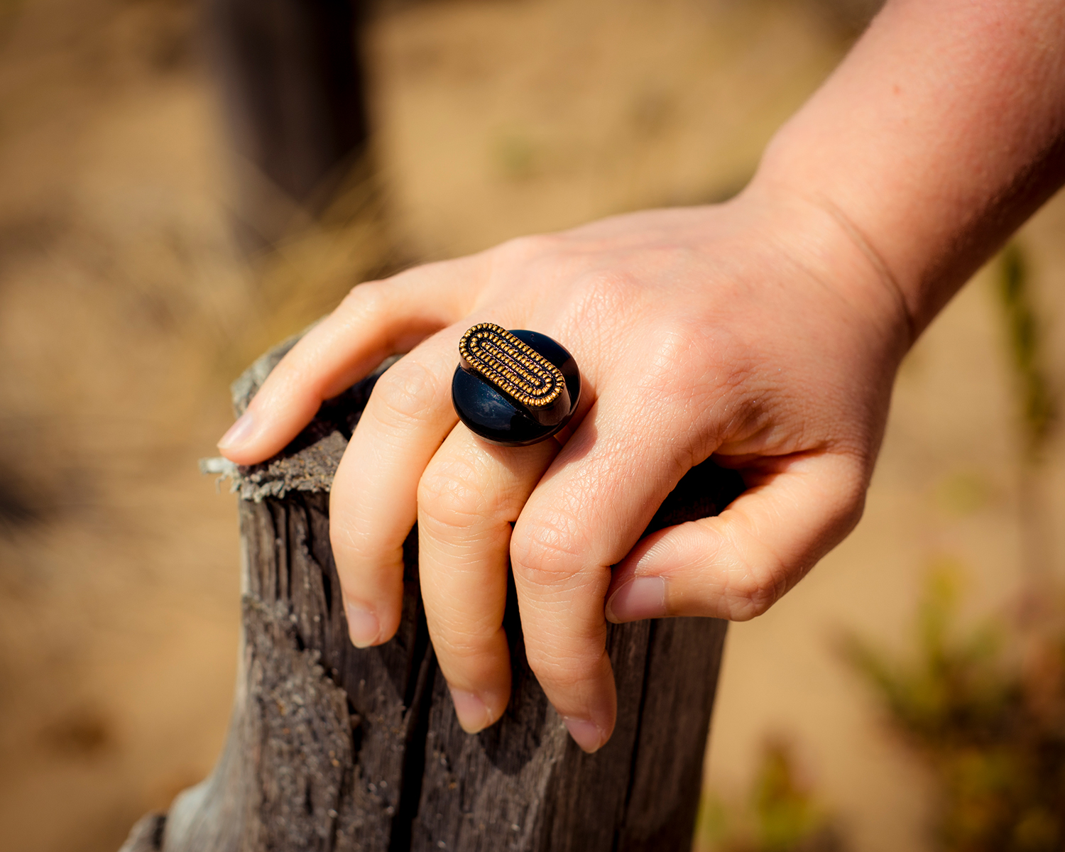 Ornée d’un bouton ancien de haute couture en pâte de verre, cette bague allie charme vintage des années 1940 et tendance intemporelle. Véritable morceau d’histoire, pépite upcyclée, elle est en somme parfaite pour vous !