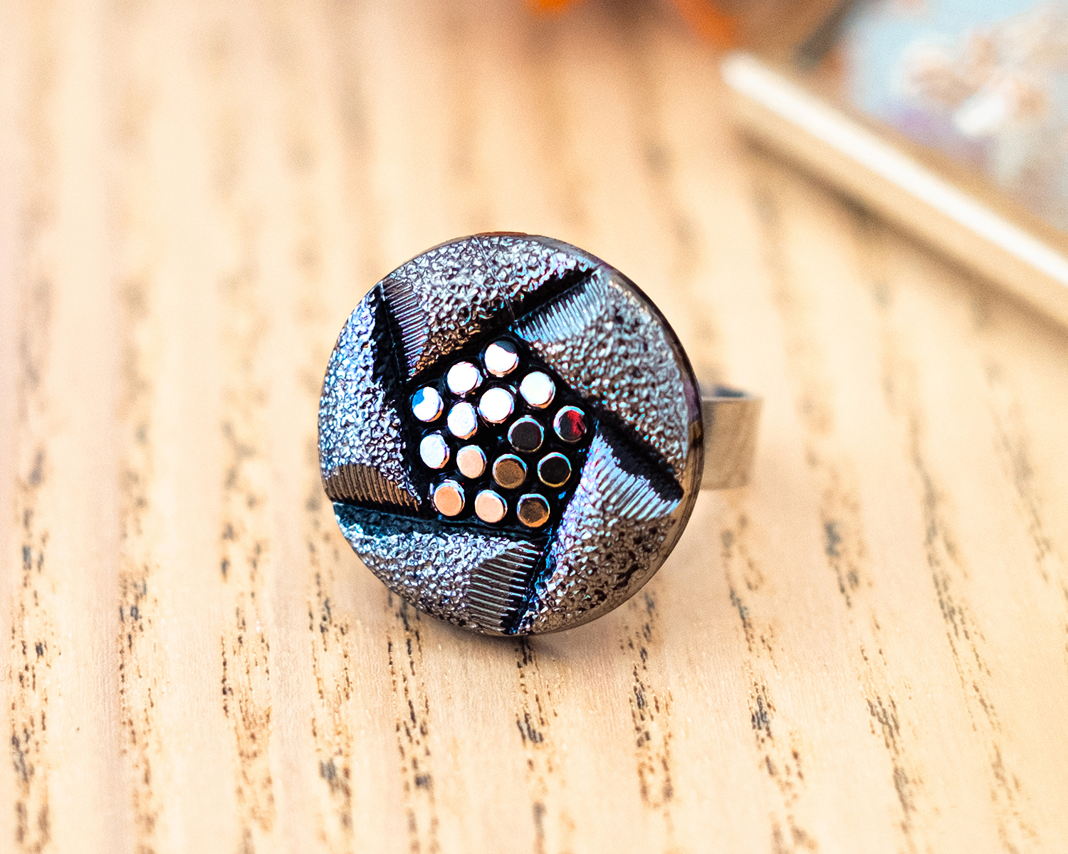 Bague ornée d’un bouton vintage argenté des années 1940 fait main en verre dans le style art déco.