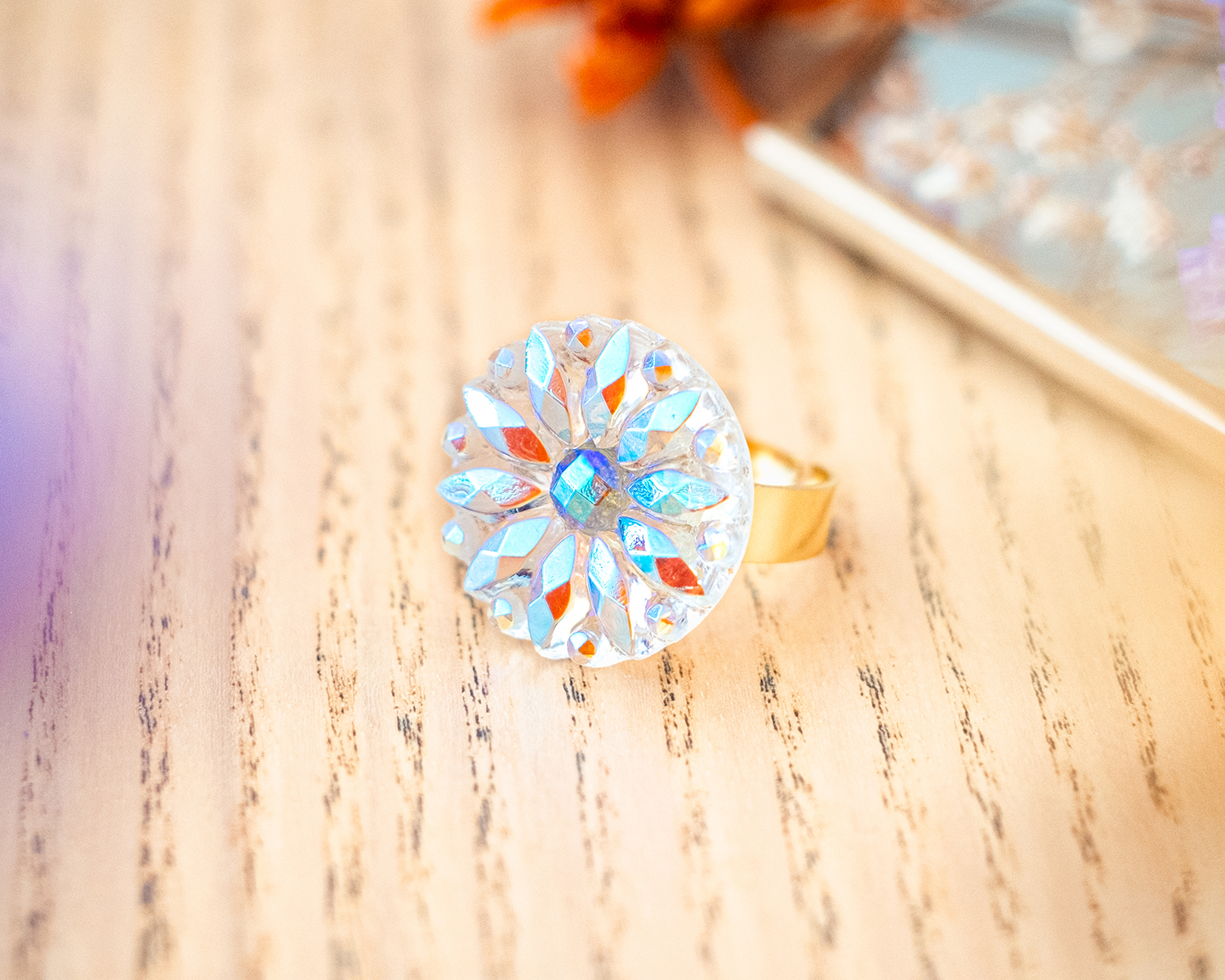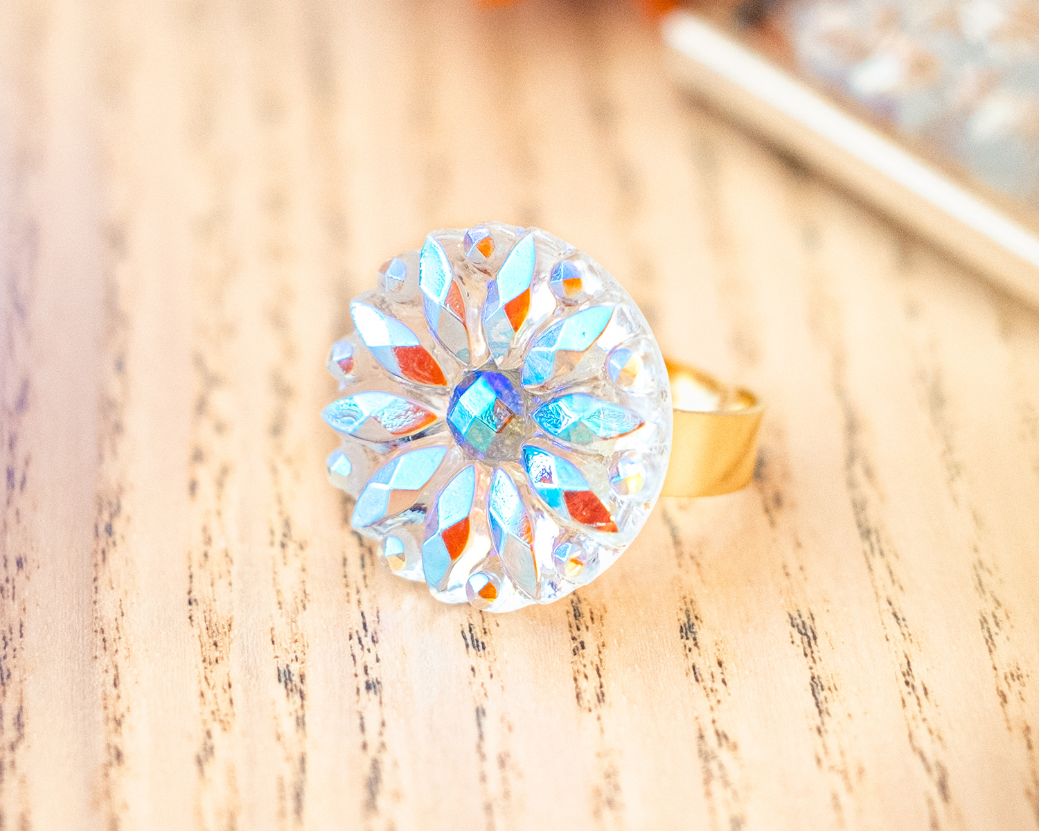 Diamètre du bouton 2,3 cm. Anneau ouvert réglable en acier inoxydable (pas d’allergie !).