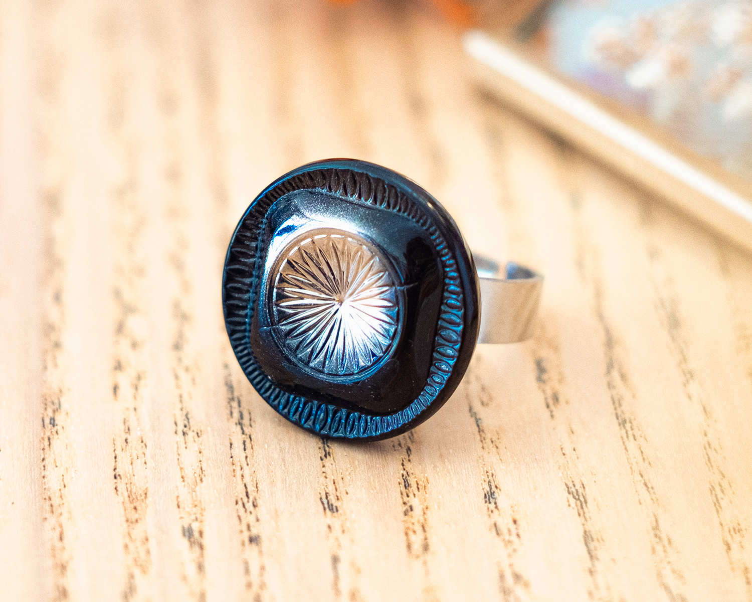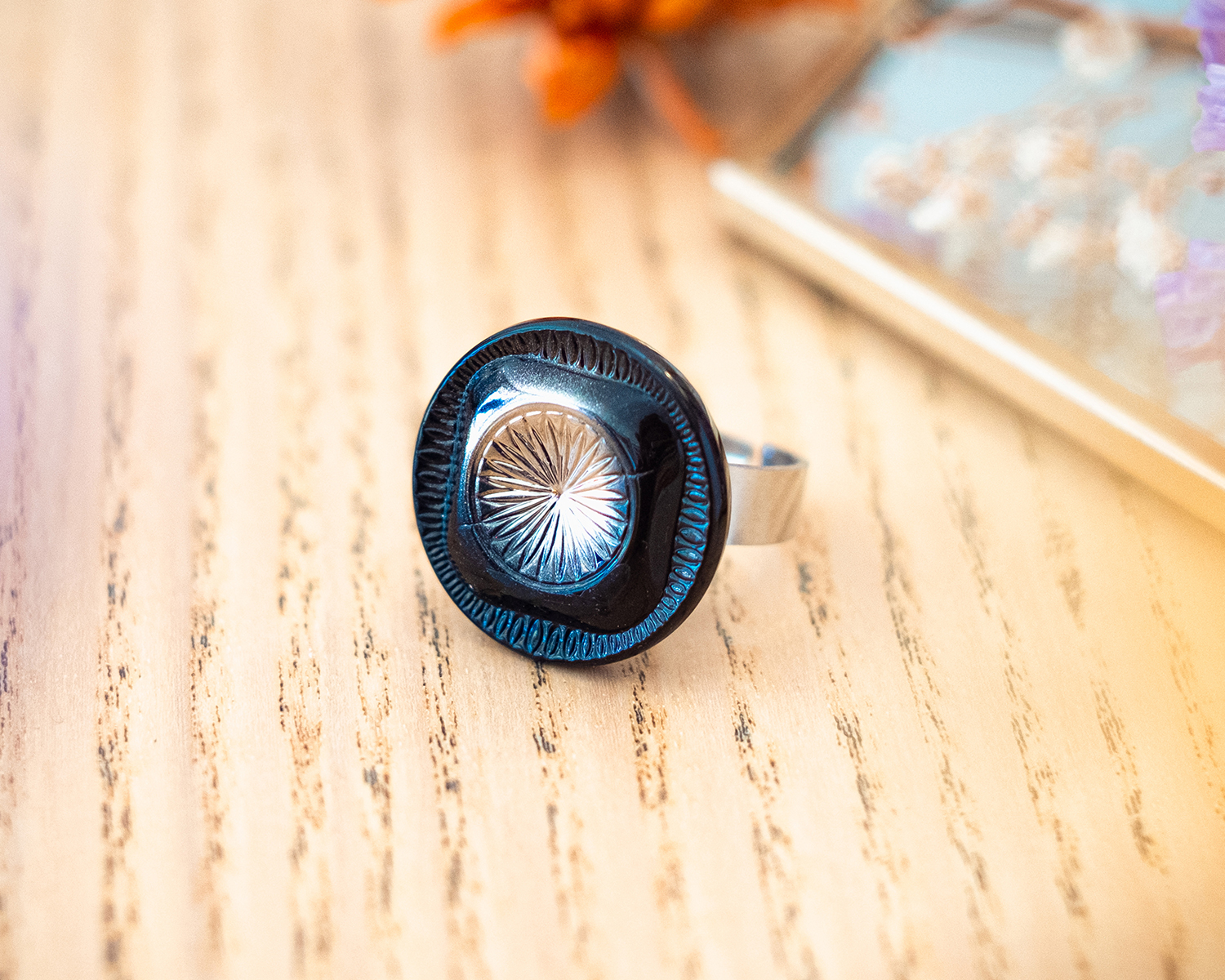 Diamètre du bouton 2,3 cm. Anneau ouvert réglable en acier inoxydable (pas d’allergie !).