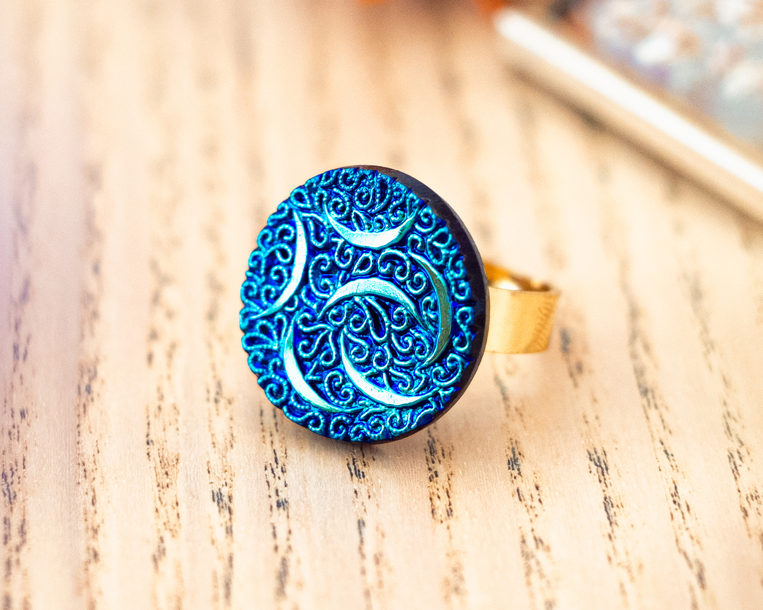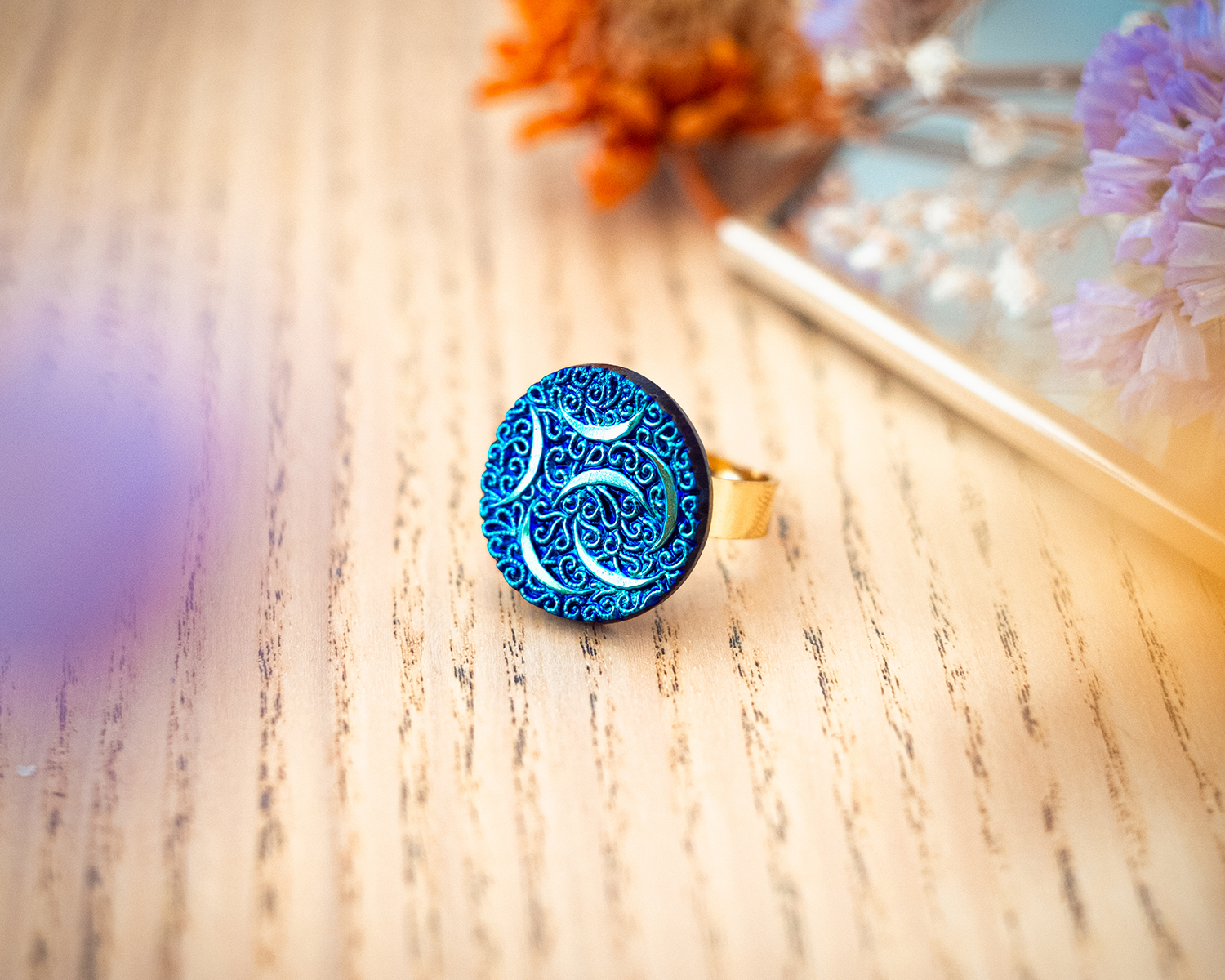 Voici la grande bague Enide bleu doré ! Elle est réglable et en acier inoxydable.