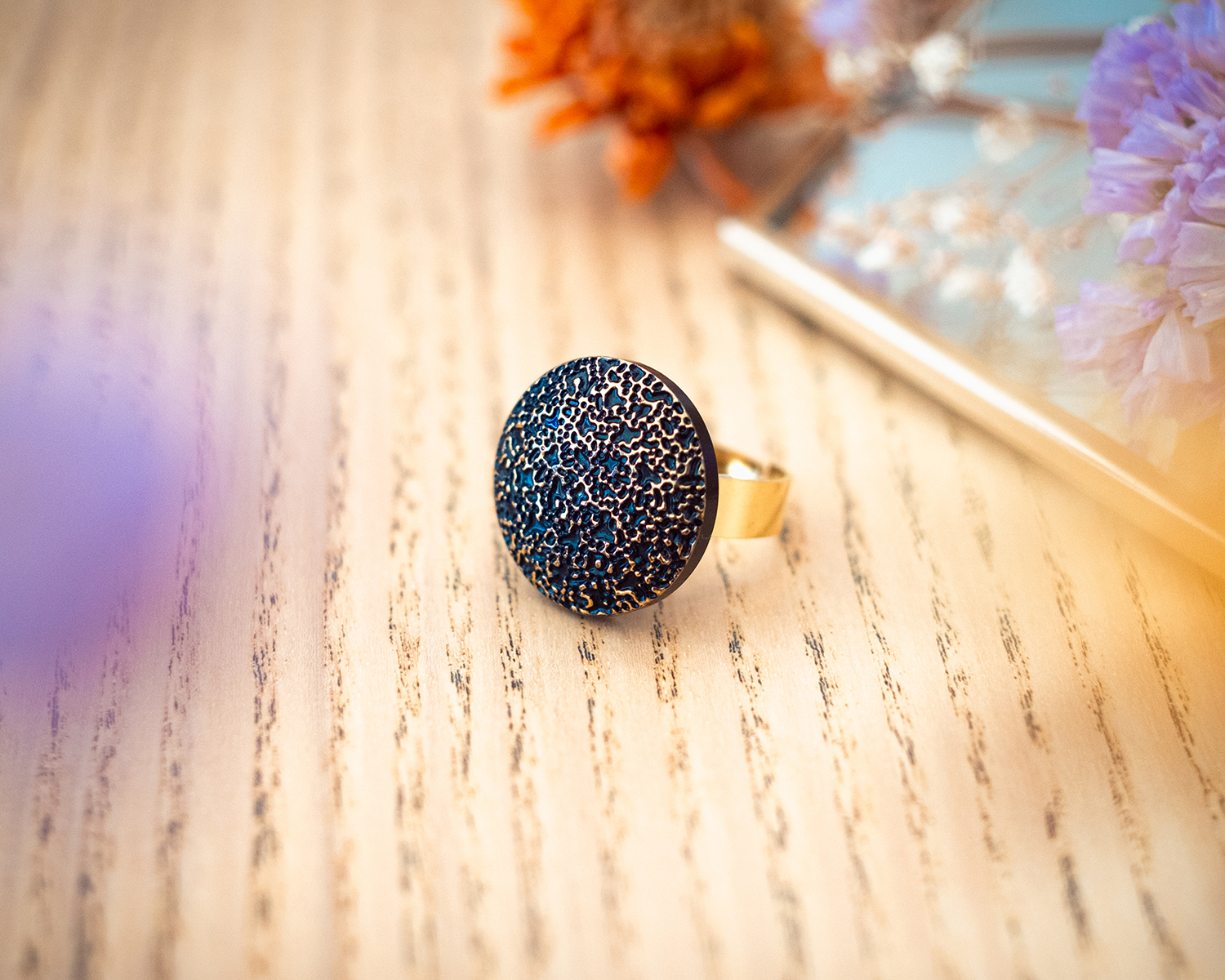 Diamètre du bouton 2,3 cm. Anneau ouvert réglable en acier inoxydable (pas d’allergie !).