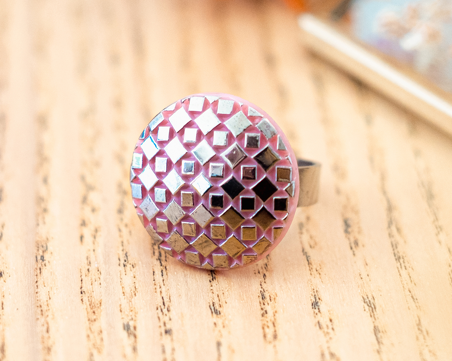 Cette pièce réalisée avec un bouton ancien de haute couture en verre évoque le raffinement des années 1940. Le délicat bouton ancien orné d’un motif géométrique à facettes argentées sur fond rose apporte une touche d’originalité à votre collection de bijoux. Que ce soit pour une occasion spéciale ou pour sublimer votre quotidien, cette bague est le cadeau unique parfait pour qui apprécie l’authenticité et le style vintage.