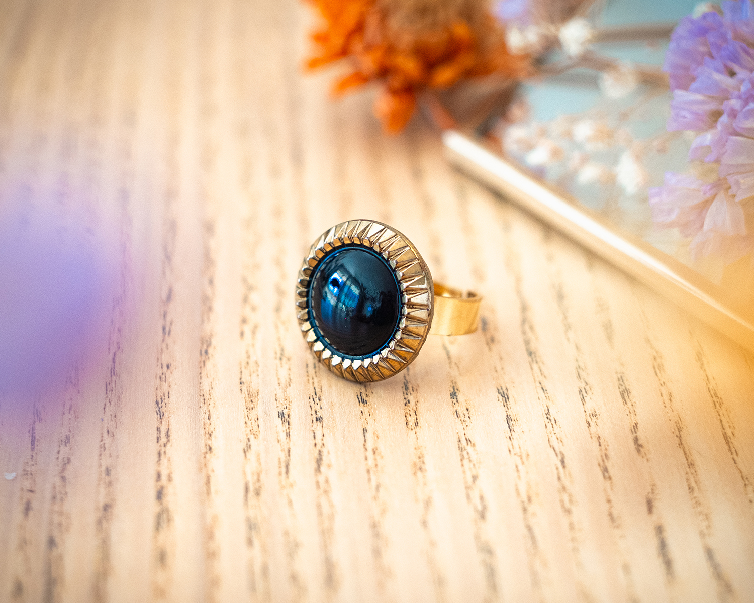 Diamètre du bouton 2,3 cm. Anneau ouvert réglable en acier inoxydable (pas d’allergie !).