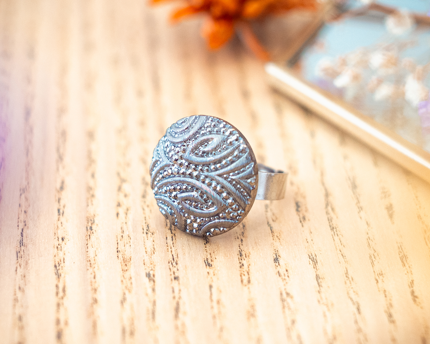 Diamètre du bouton 2,3 cm. Anneau ouvert réglable en acier inoxydable (pas d’allergie !).