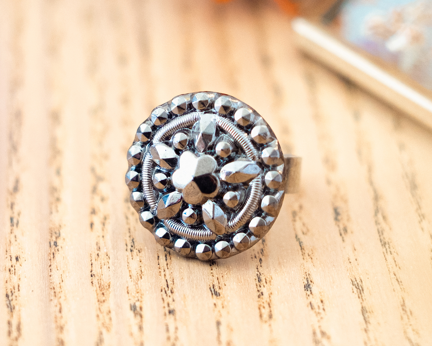 Ornée d’un bouton ancien de haute couture en pâte de verre, cette bague allie charme vintage des années 1940 et tendance intemporelle. Véritable morceau d’histoire, pépite upcyclée, elle est en somme parfaite pour vous !