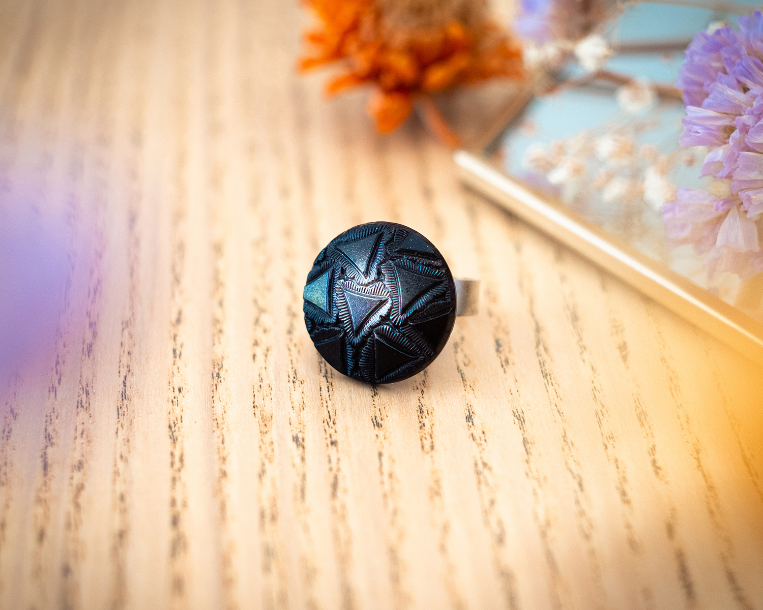 Diamètre du bouton 2,3 cm. Anneau ouvert réglable en acier inoxydable (pas d’allergie !).