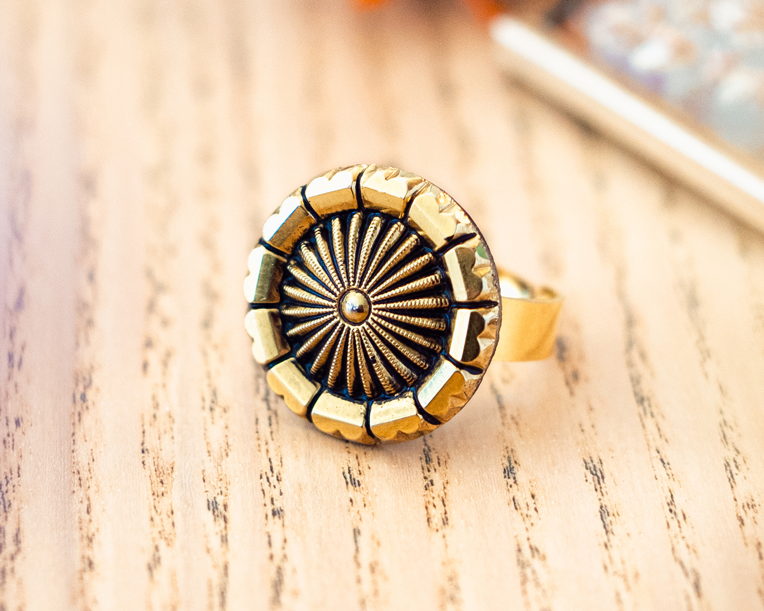 Grande bague Libanthe, bague réglable ornée d’un bouton vintage des années 1940 fait main en verre dans le style art déco par Assuna.