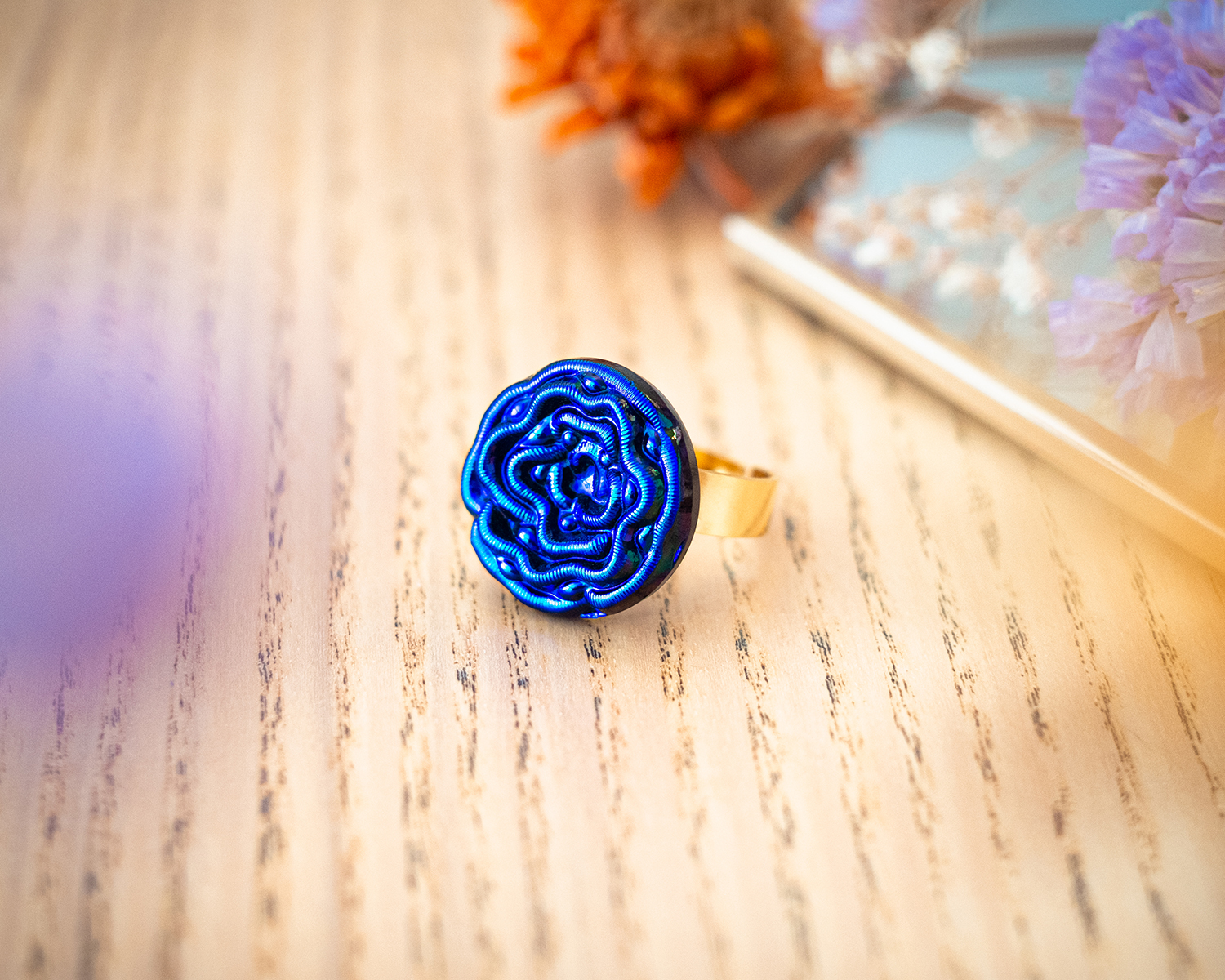Cette pièce réalisée avec un bouton ancien de haute couture en verre évoque le raffinement des années 1940. Le délicat bouton ancien orné d’un motif floral bleu irisé apporte une touche d’originalité à votre collection de bijoux. Que ce soit pour une occasion spéciale ou pour sublimer votre quotidien, cette bague est le cadeau unique parfait pour qui apprécie l’authenticité et le style vintage.