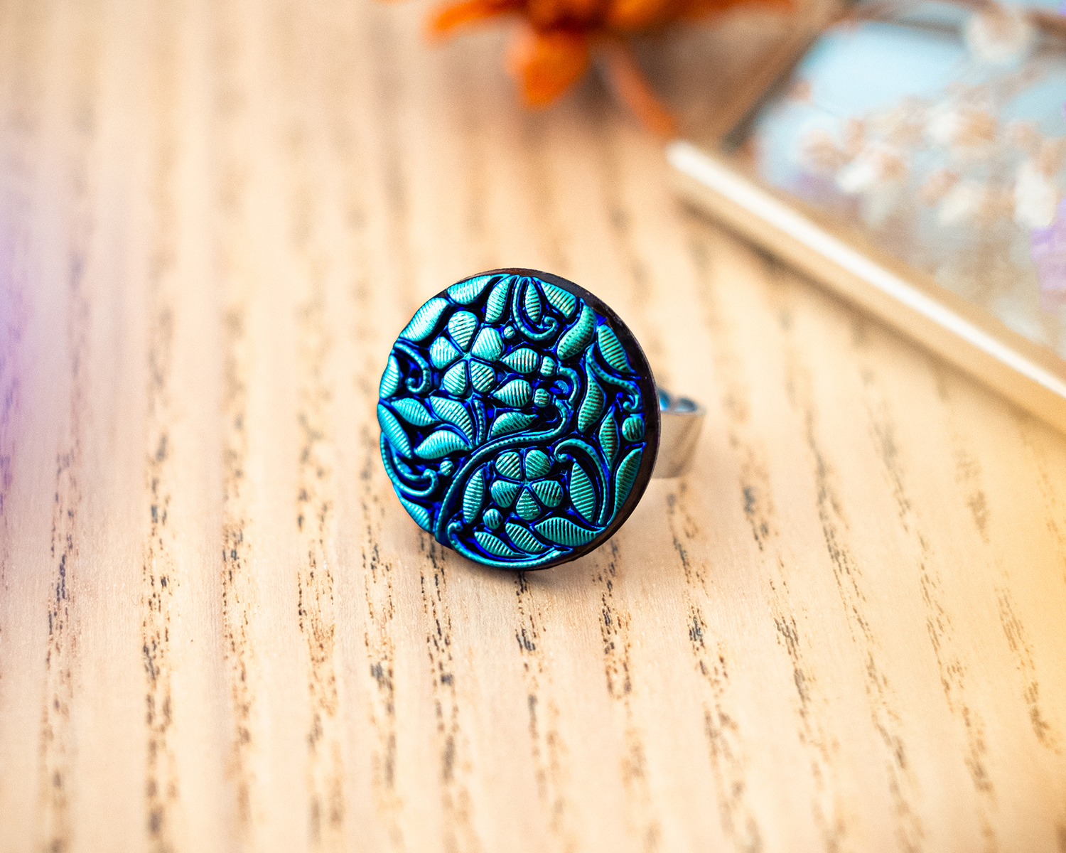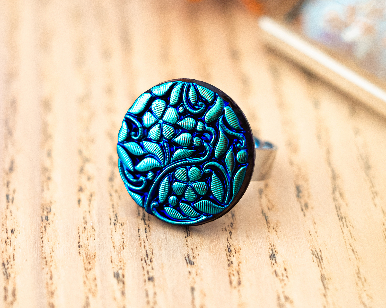 Diamètre du bouton 2,3 cm. Anneau ouvert réglable en acier inoxydable (pas d’allergie !).