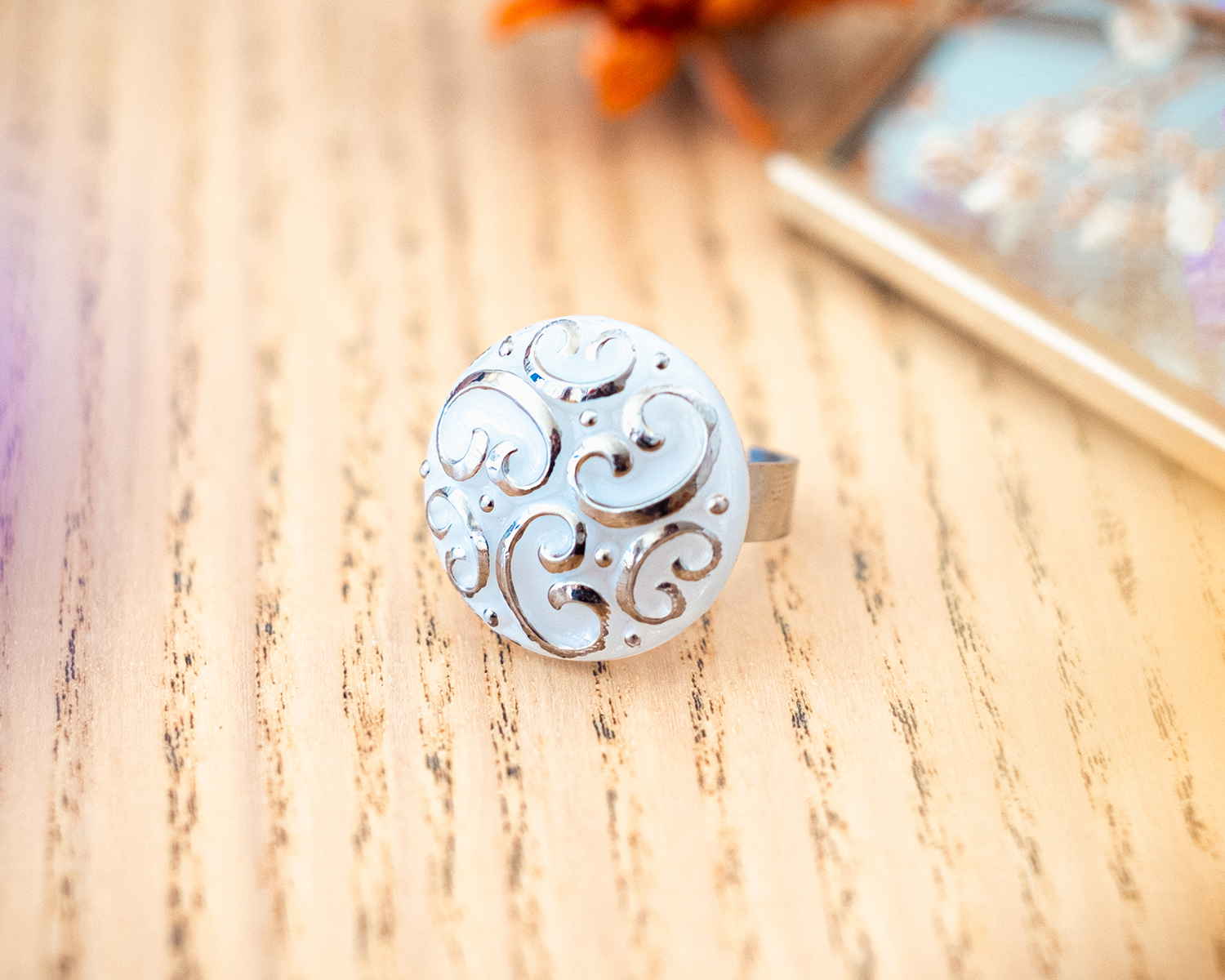 Ajoutez une touche élégante vintage à votre style avec la grande bague Thelma blanc argenté.