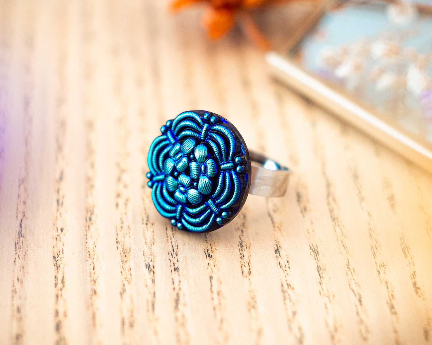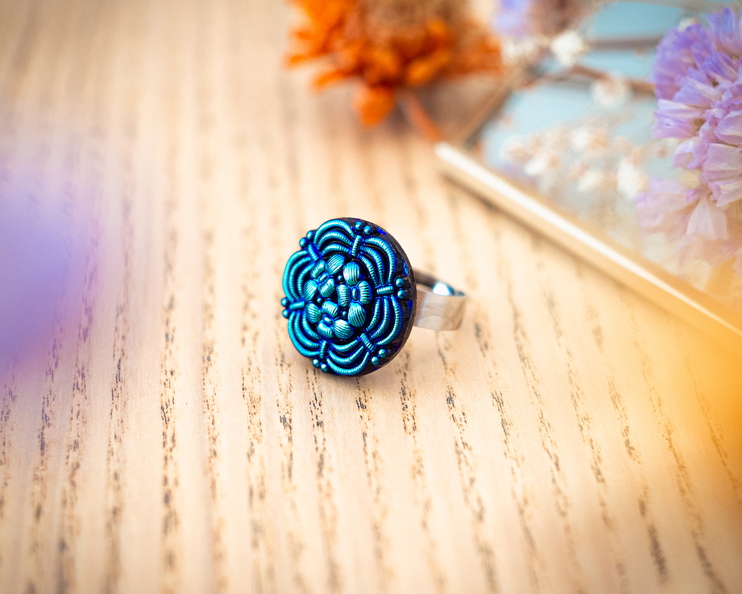 Diamètre du bouton 2,3 cm. Anneau ouvert réglable en acier inoxydable (pas d’allergie !).