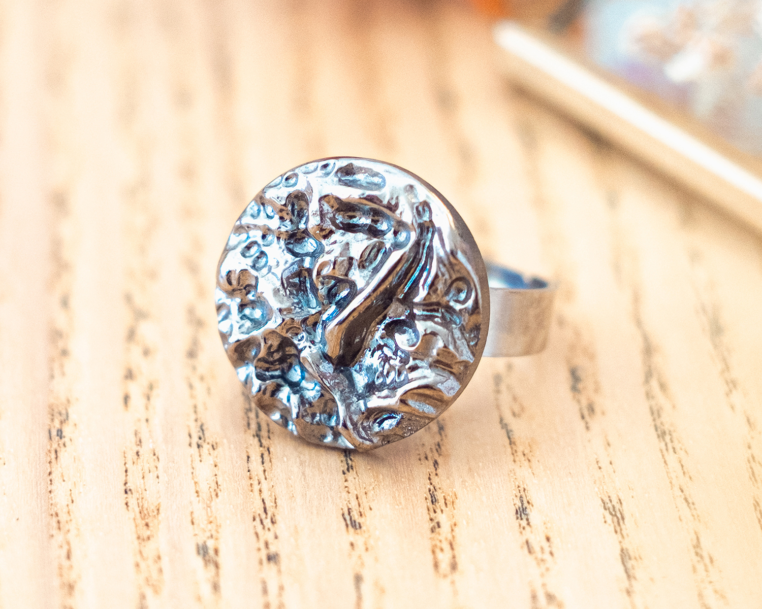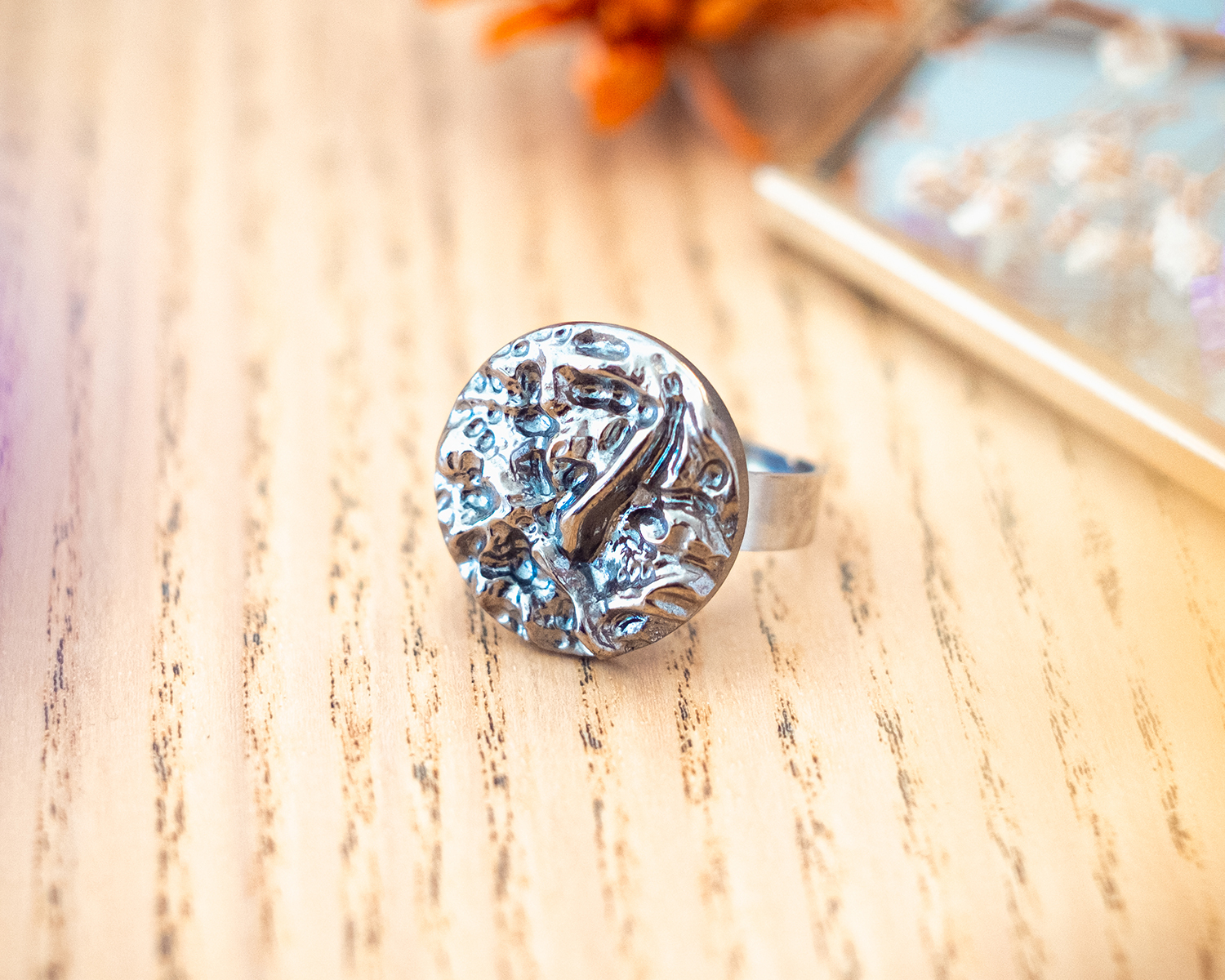 Diamètre du bouton 2,3 cm. Anneau ouvert réglable en acier inoxydable (pas d’allergie !).