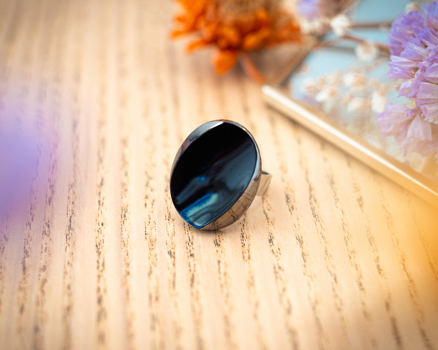 Dimensions du bouton ovale 2,3 x 2,7 cm. Anneau ouvert réglable en acier inoxydable (pas d’allergie !).