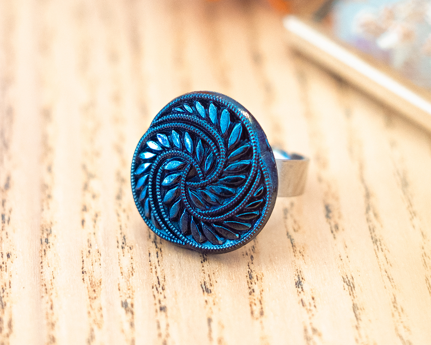 Grande bague Zelda bleue, bague réglable ornée d’un bouton vintage des années 1940 fait main en verre dans le style art déco par Assuna.