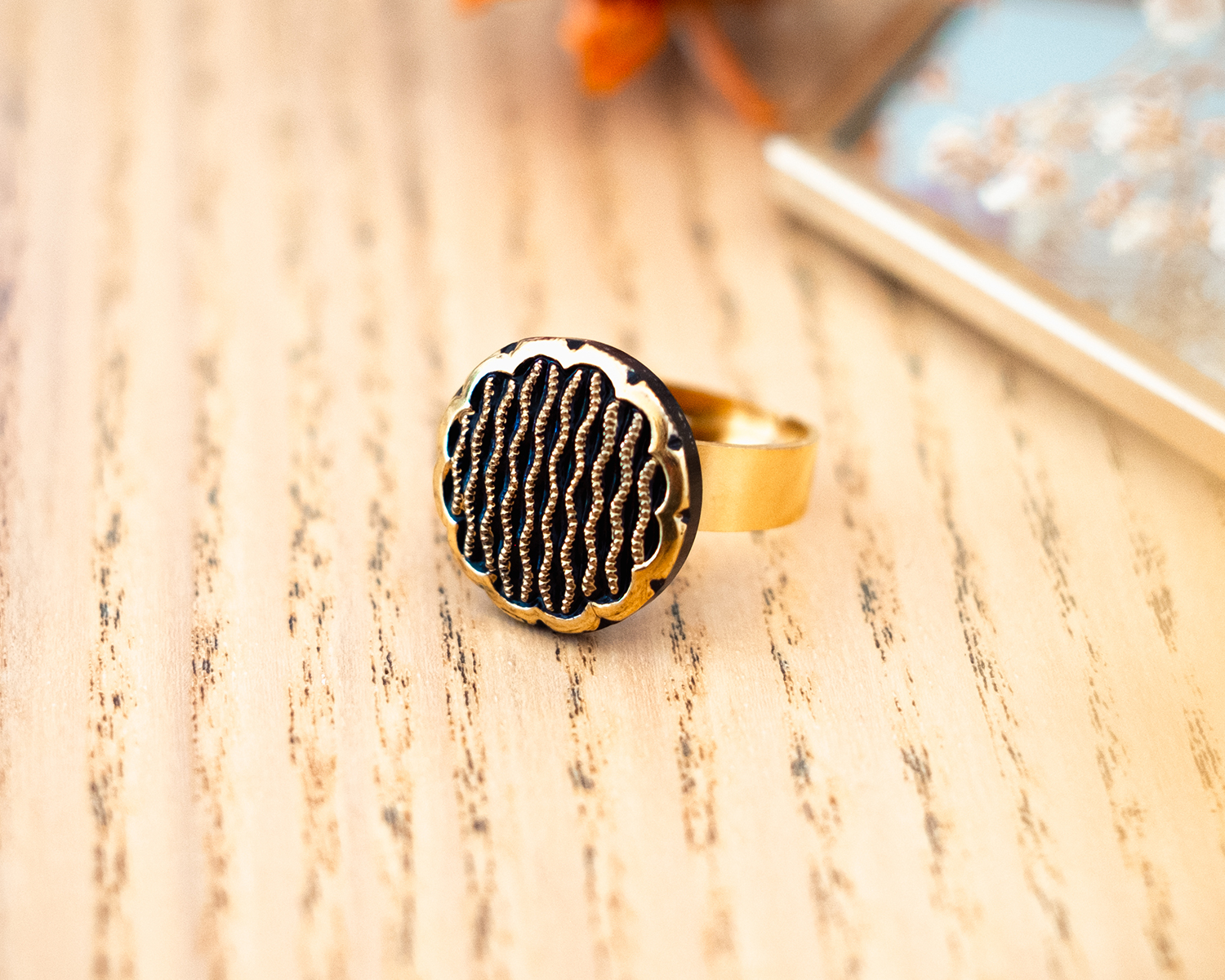 Cette pièce réalisée avec un bouton ancien de haute couture en verre évoque le raffinement des années 1940. Le délicat bouton ancien orné d’un motif art déco géométrique noir et doré qui apporte une touche d’originalité à votre collection de bijoux. Que ce soit pour une occasion spéciale ou pour sublimer votre quotidien, cette bague est le cadeau unique parfait pour qui apprécie l’authenticité et le style vintage.