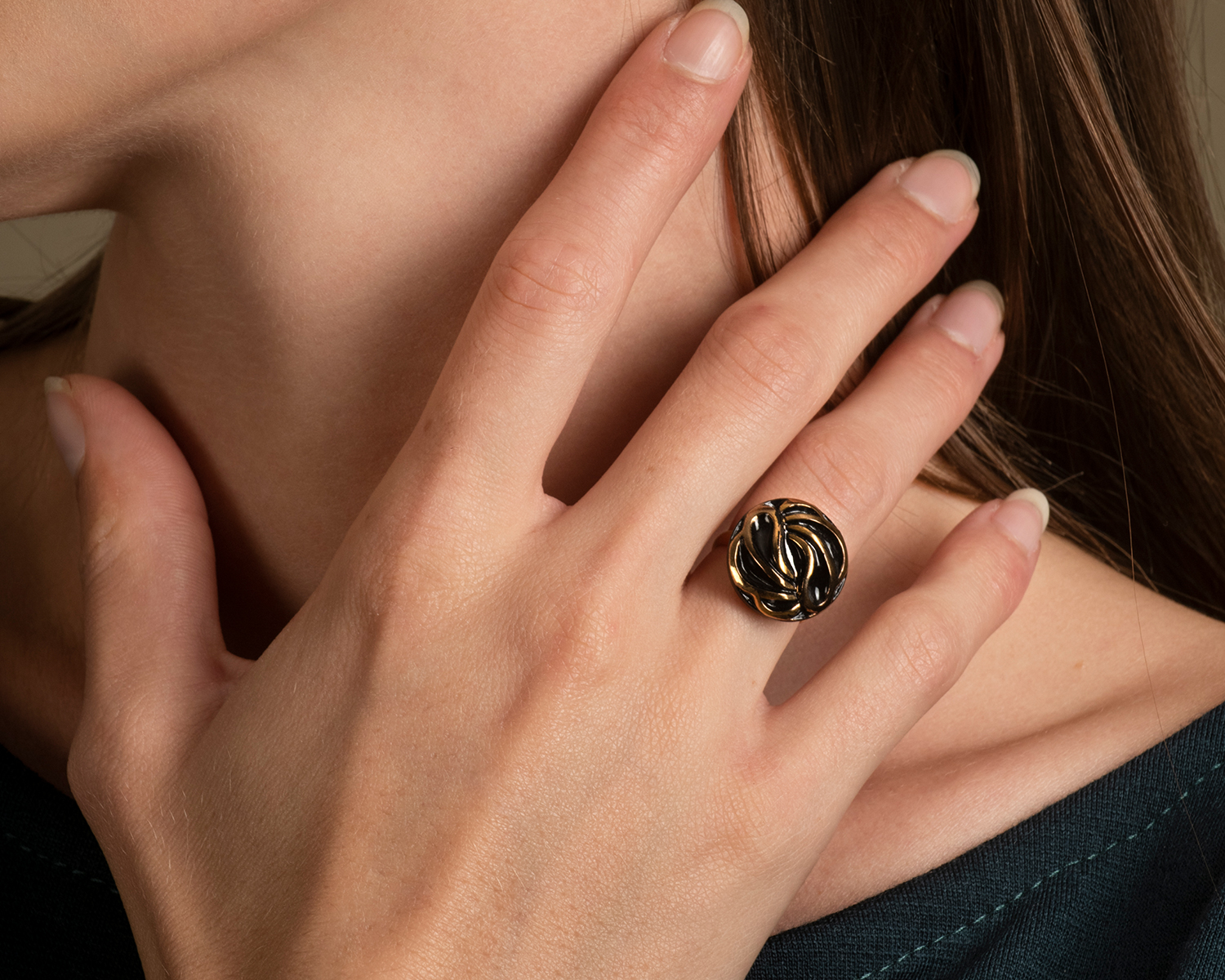 Large et réglable, l’anneau de la bague est conçu pour s’adapter à toutes les tailles de doigts, offrant un confort optimal tout en restant chic. Son design minimaliste met en valeur le bouton ancien, créant un contraste saisissant entre le moderne et le vintage.