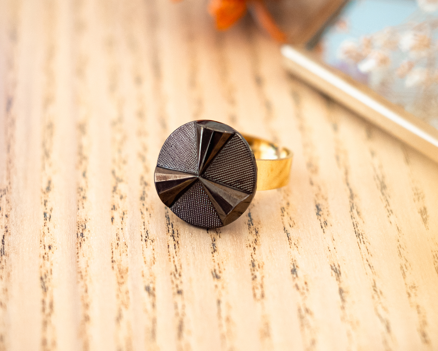 Petite bague Angèle bronze, bague réglable ornée d’un bouton vintage des années 1940 fait main en verre dans le style art déco par Assuna.