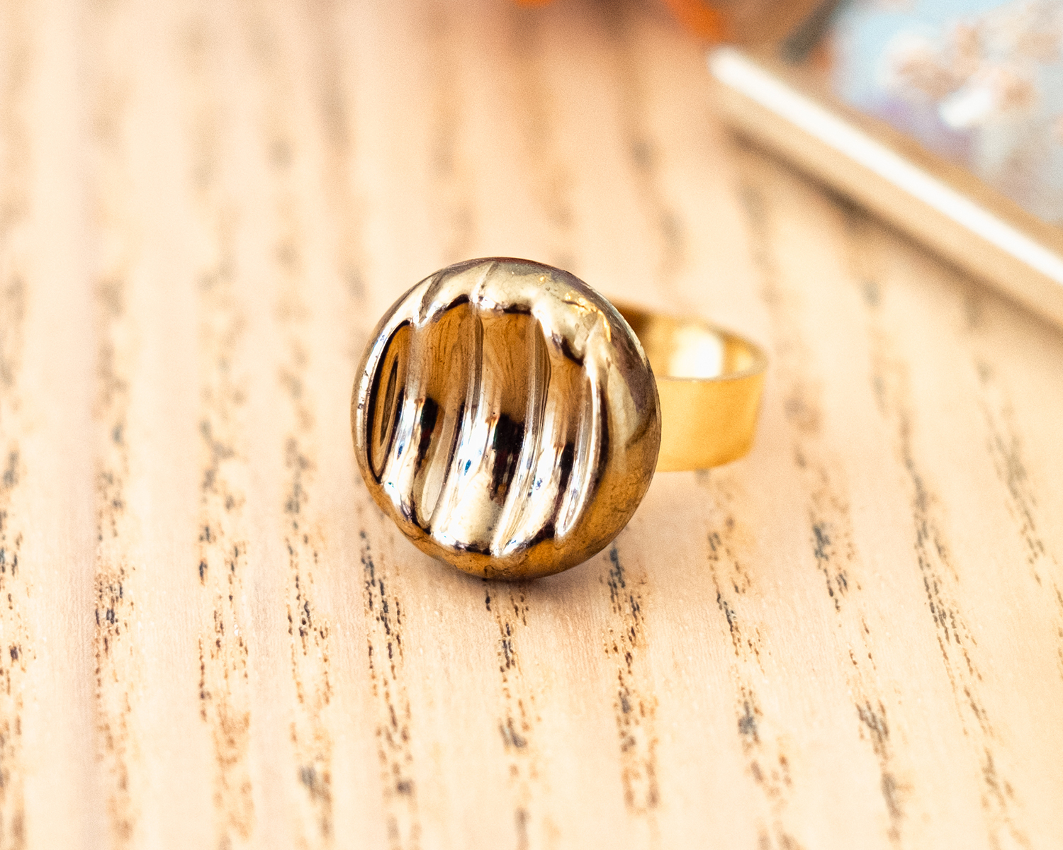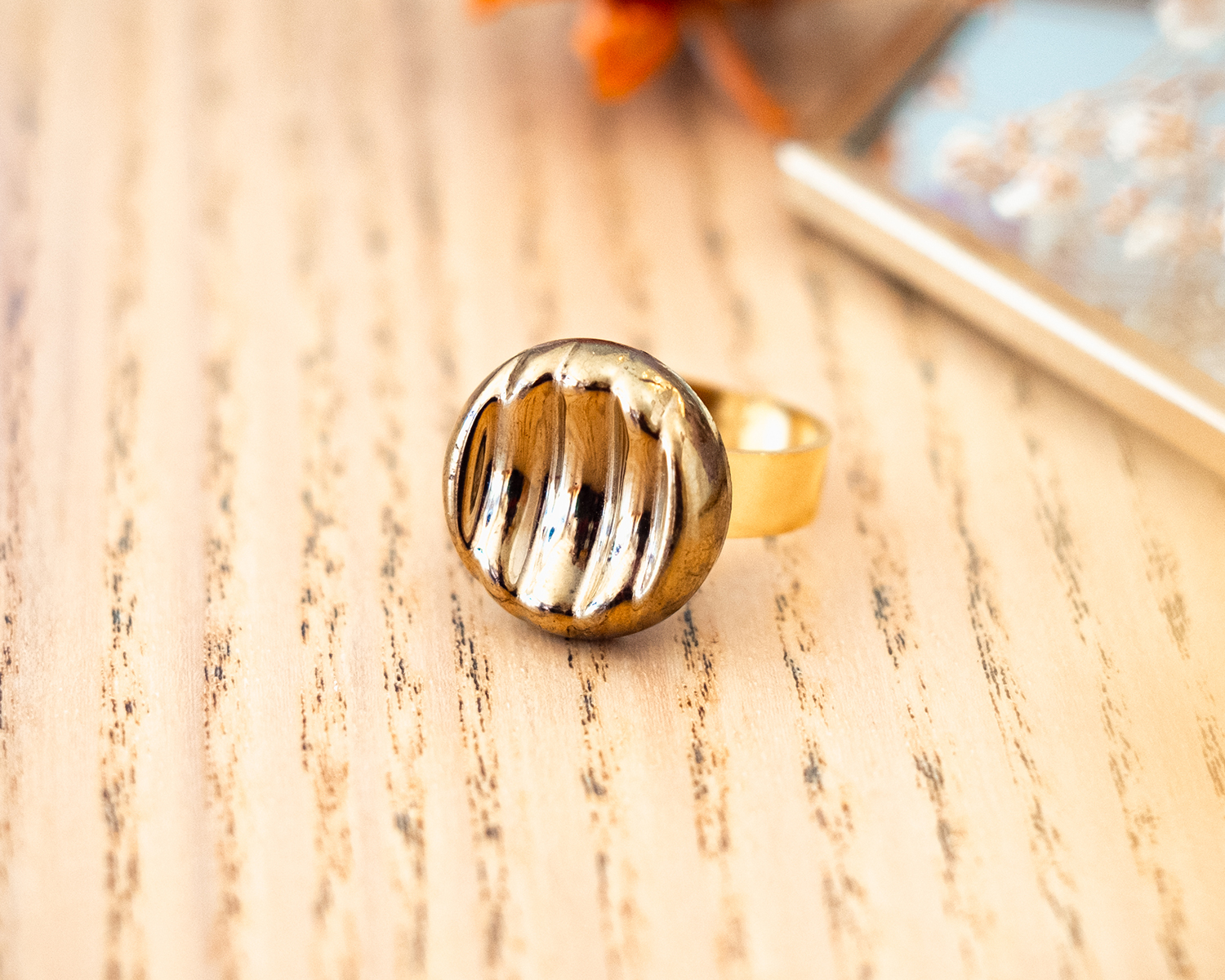 Petite bague Gina dorée, bague réglable ornée d’un bouton vintage des années 1940 fait main en verre dans le style art déco par Assuna.