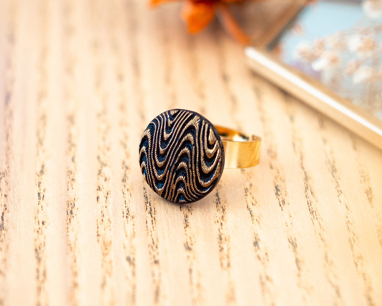 Diamètre du bouton 1,8 cm. Anneau ouvert réglable en acier inoxydable (pas d’allergie !).