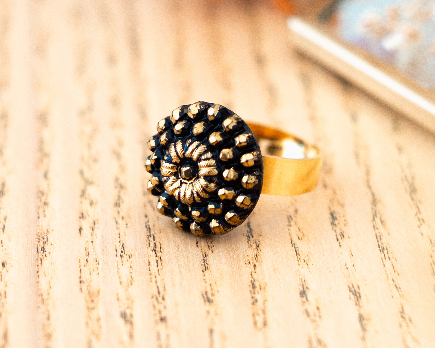 Petite bague Marthe dorée, bague réglable ornée d’un bouton vintage des années 1940 fait main en verre dans le style art déco par Assuna.