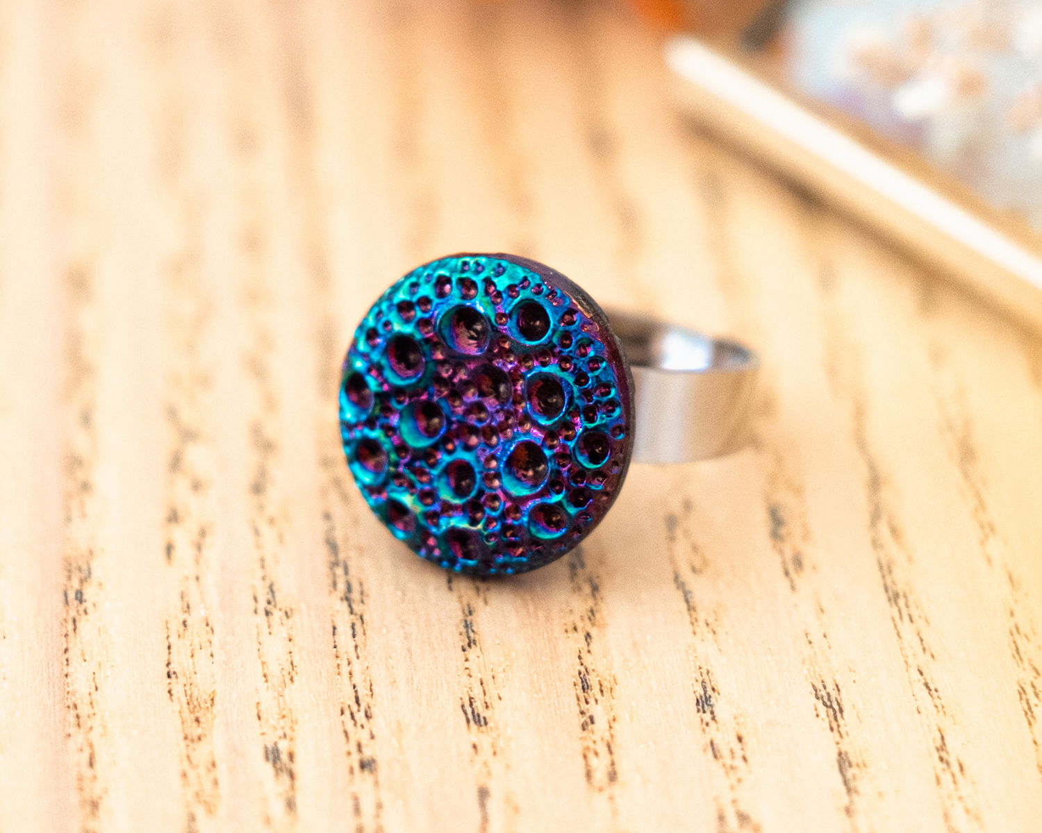 Diamètre du bouton 1,8 cm. Anneau ouvert réglable en acier inoxydable (pas d’allergie !).