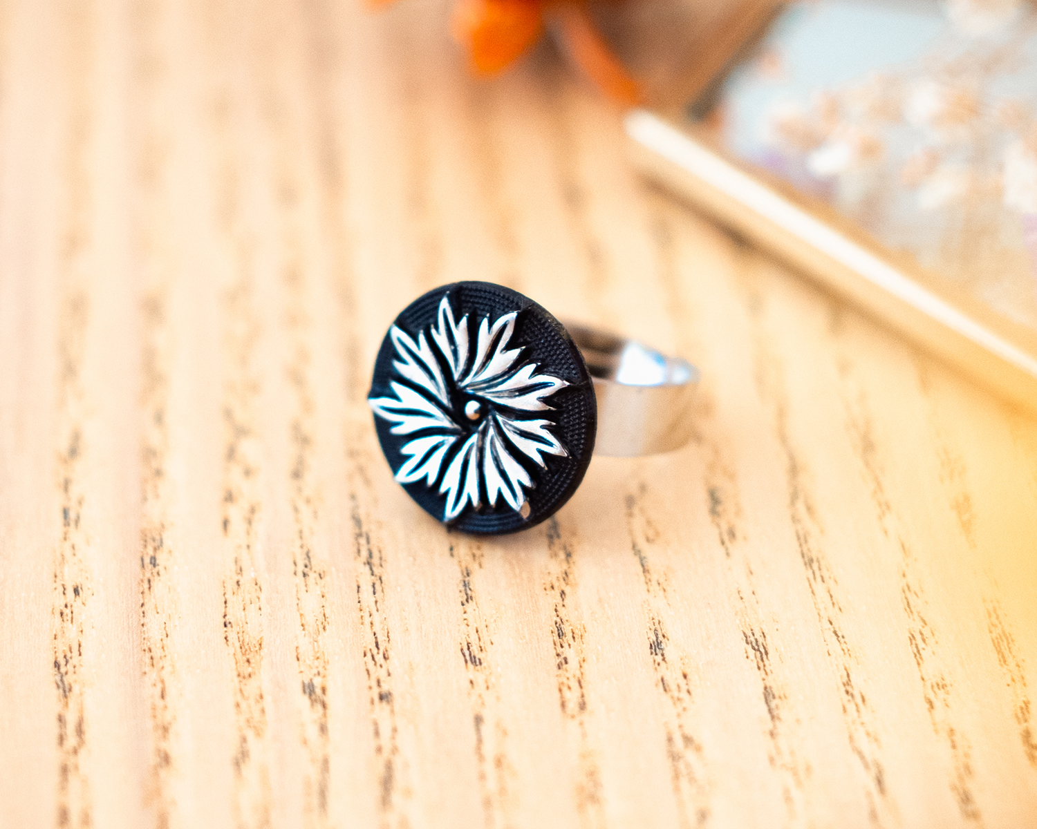 Cette pièce réalisée avec un bouton ancien de haute couture en verre évoque le raffinement des années 1940. Le délicat bouton ancien orné d’un motif floral argenté sur fond noir apporte une touche d’originalité à votre collection de bijoux. Que ce soit pour une occasion spéciale ou pour sublimer votre quotidien, cette bague est le cadeau unique parfait pour lui apprécie l’authenticité et le style vintage.