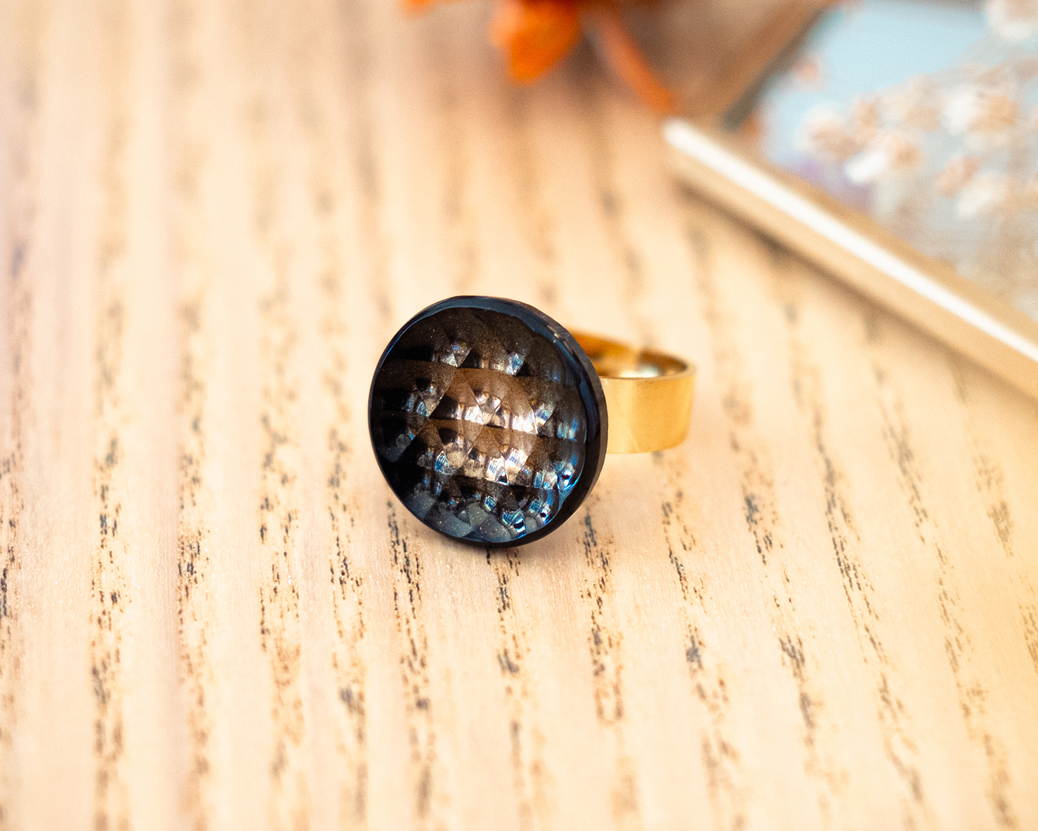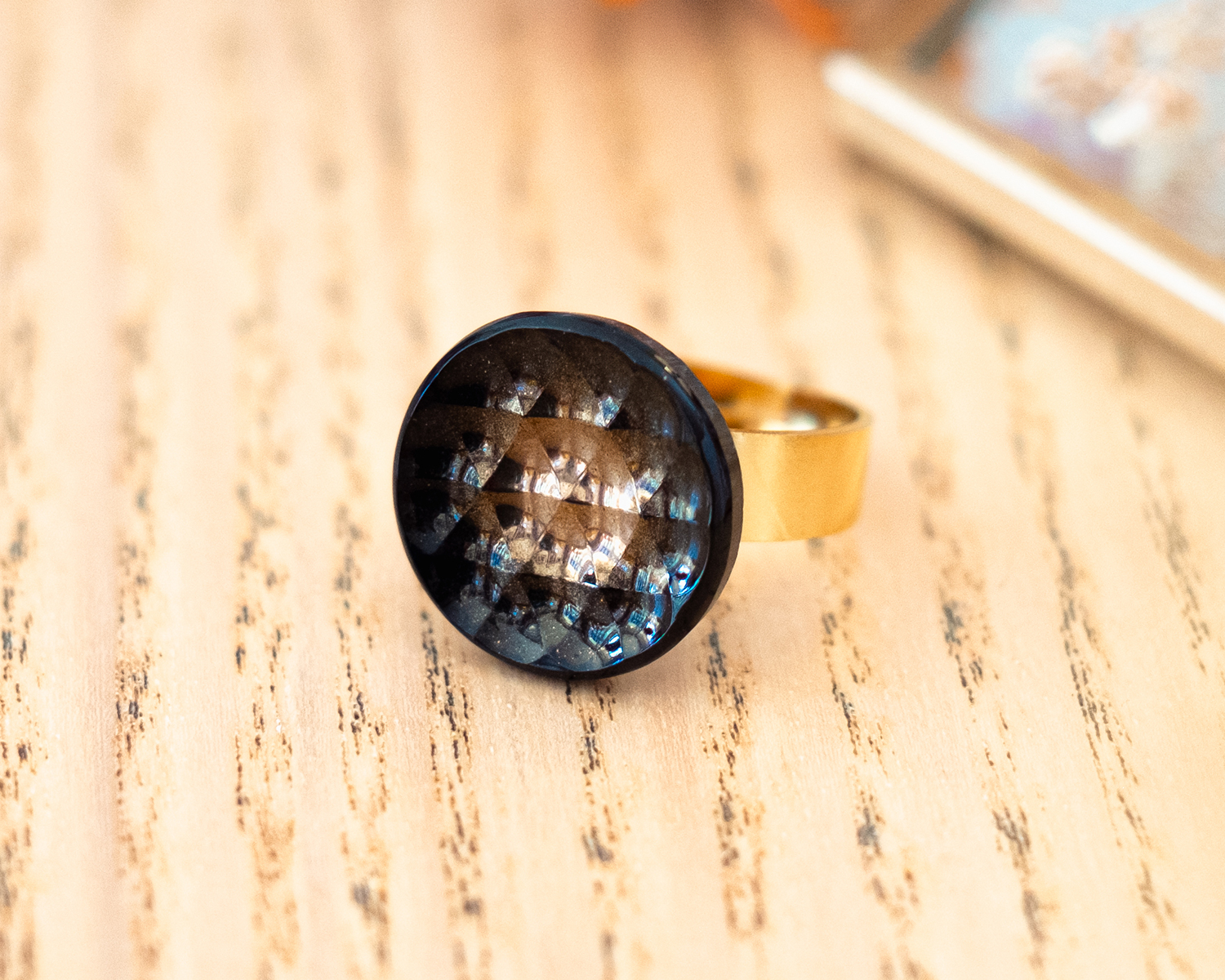 Petite bague Orise, bague réglable ornée d’un bouton vintage des années 1940 fait main en verre dans le style art déco par Assuna.