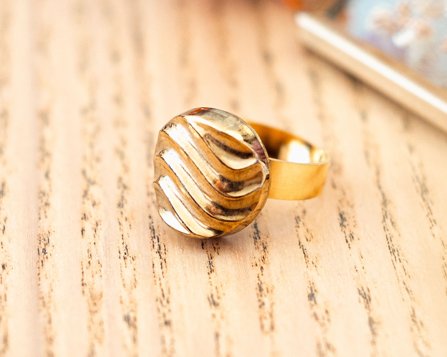 Voici la petite bague Simone dorée ! Elle est réglable et en acier inoxydable.