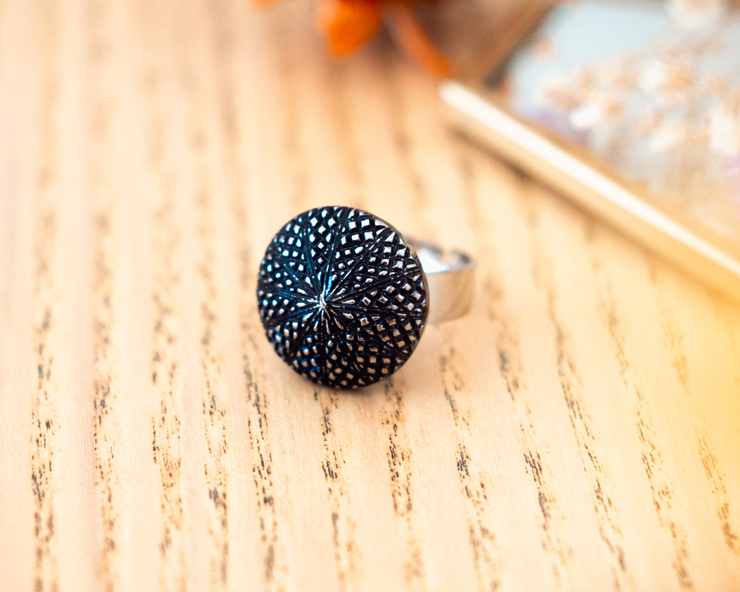 Diamètre du bouton 1,8 cm. Anneau ouvert réglable en acier inoxydable (pas d’allergie !).